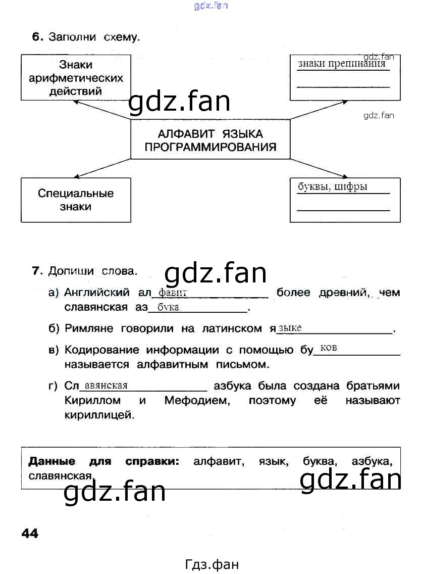 Проверка домашнего задания всегда занимает большое количество времени. На помощь приходит ГДЗ фан по Информатике второго класса. Здесь собраны популярные ответы на 44 (§9 задания 6, 7) Информатика 2 класс рабочая тетрадь Матвеева Н.В.