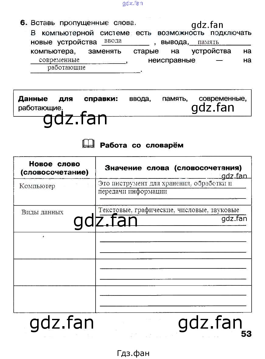 Проверка домашнего задания всегда занимает большое количество времени. На помощь приходит ГДЗ фан по Информатике третьего класса. Здесь собраны популярные ответы на 53 (задание 6) Информатика 3 класс рабочая тетрадь Матвеева Н.В.