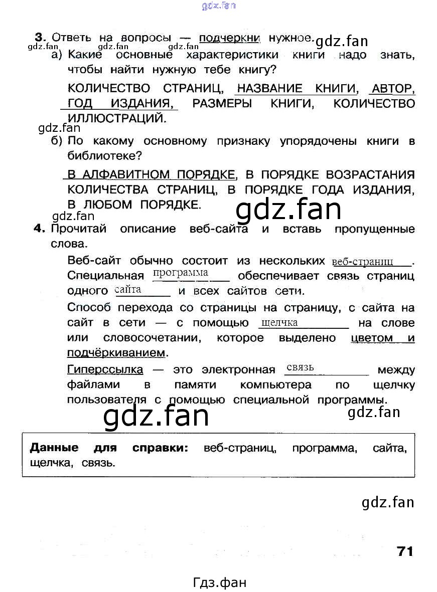 Проверка домашнего задания всегда занимает большое количество времени. На помощь приходит ГДЗ фан по Информатике третьего класса. Здесь собраны популярные ответы на 71 (задание 3, 4) Информатика 3 класс рабочая тетрадь Матвеева Н.В.