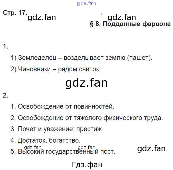Проверка домашнего задания всегда занимает большое количество времени. На помощь приходит ГДЗ фан по Истории пятого класса. Здесь собраны популярные ответы на 17 (§8. Подданные фараона № 1, 2) История Древнего мира 5 класс рабочая тетрадь Ванина Э.В.