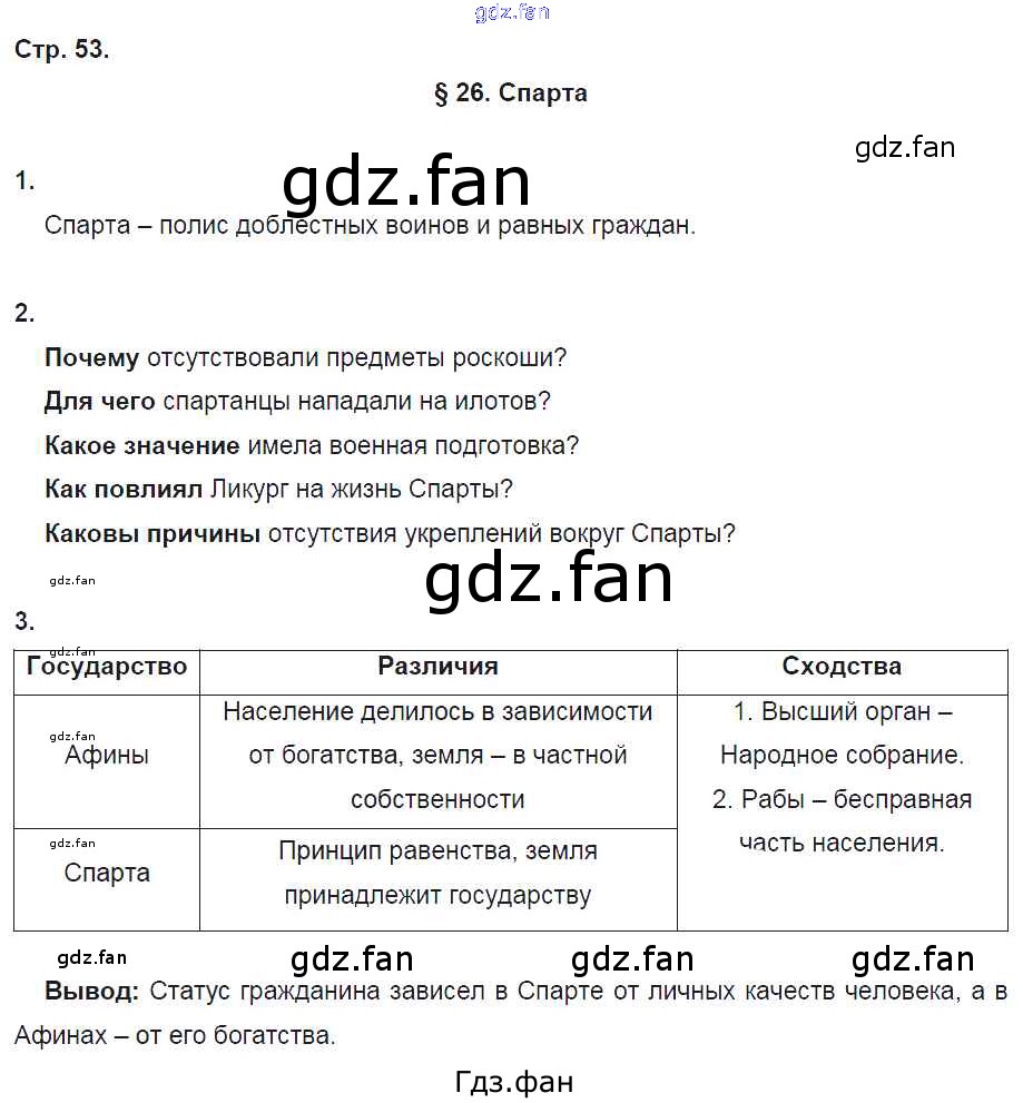 Проверка домашнего задания всегда занимает большое количество времени. На помощь приходит ГДЗ фан по Истории пятого класса. Здесь собраны популярные ответы на 53 (§26. Спарта № 1, 2, 3) История Древнего мира 5 класс рабочая тетрадь Ванина Э.В.