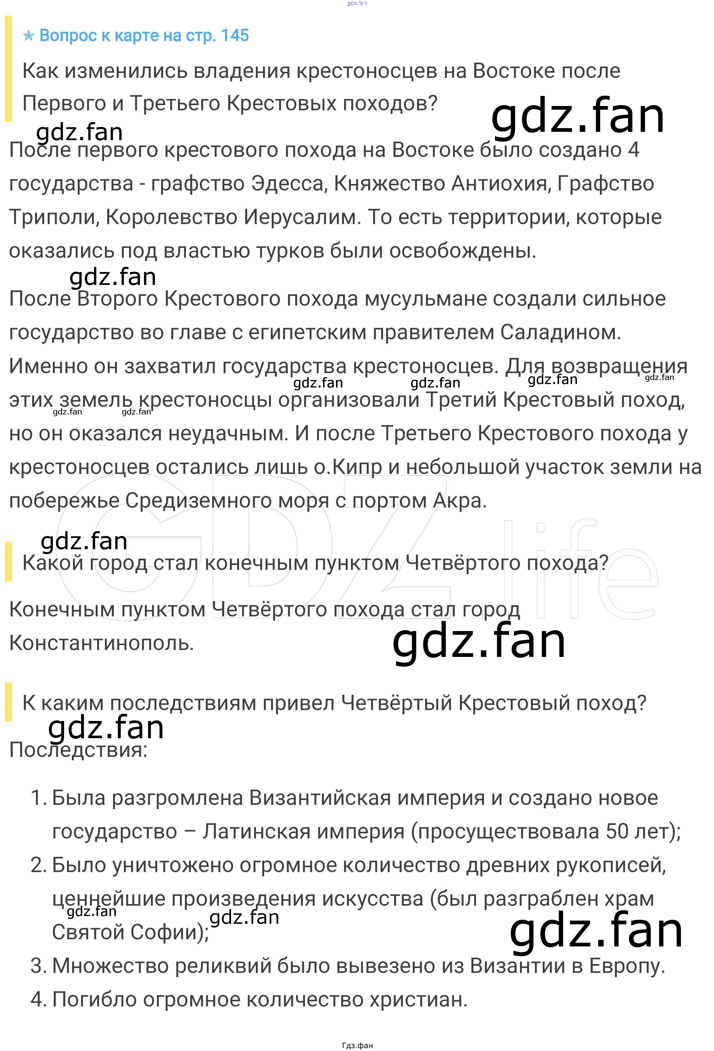 Проверка домашнего задания всегда занимает большое количество времени. На помощь приходит ГДЗ фан по Истории шестого класса. Здесь собраны популярные ответы на стр. 145 Всеобщая история. История средних веков 6 класс Агибалова Е.В.