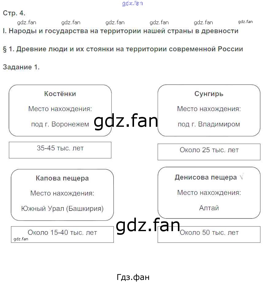 Проверка домашнего задания всегда занимает большое количество времени. На помощь приходит ГДЗ фан по Истории шестого класса. Здесь собраны популярные ответы на 4 (§1. Древние люди и их стоянки на территории современной России № 1) История России 6 класс рабочая тетрадь Чернова М.Н. (к уч. Торкунова)