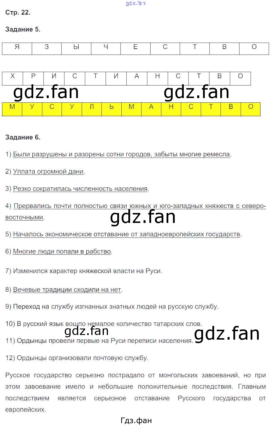 Проверка домашнего задания всегда занимает большое количество времени. На помощь приходит ГДЗ фан по Истории шестого класса. Здесь собраны популярные ответы на 22 (№ 5, 6) История России 6 класс рабочая тетрадь Чернова М.Н. (к уч. Торкунова)