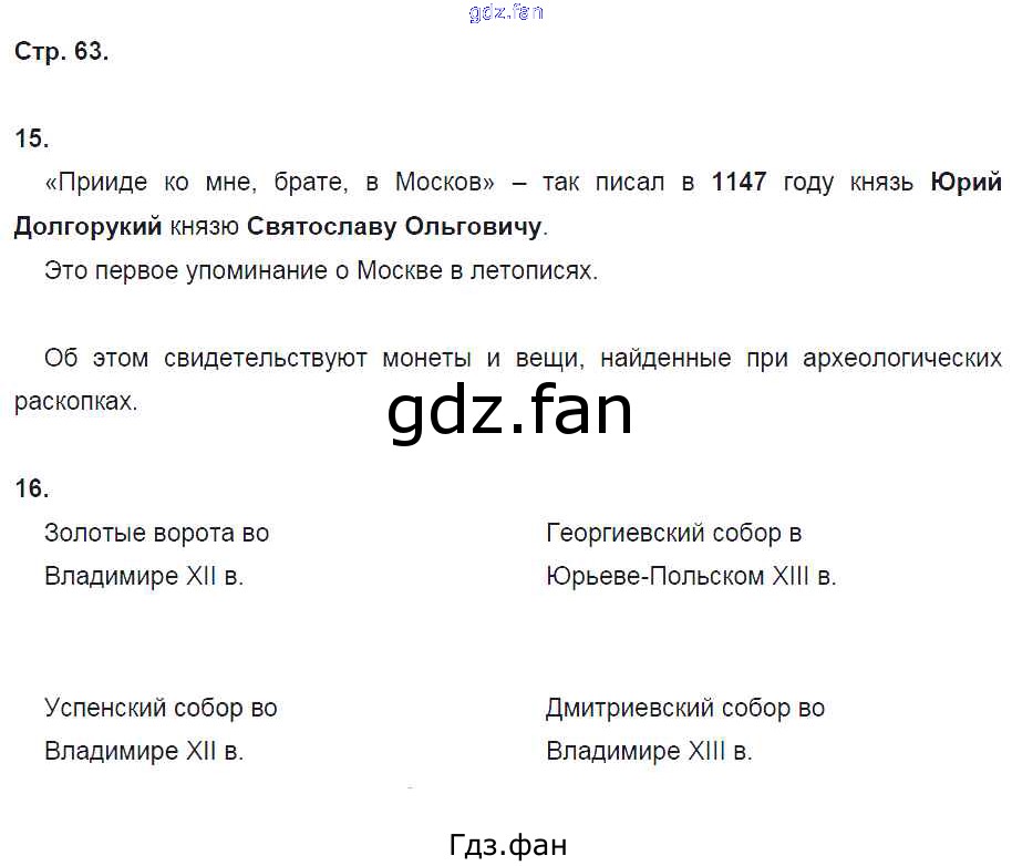 Проверка домашнего задания всегда занимает большое количество времени. На помощь приходит ГДЗ фан по Истории шестого класса. Здесь собраны популярные ответы на 63 (№ 15, 16) История России с древнейших времен до начала XVI века 6 класс рабочая тетрадь Кочегаров К.А. (к уч. Пчелова)