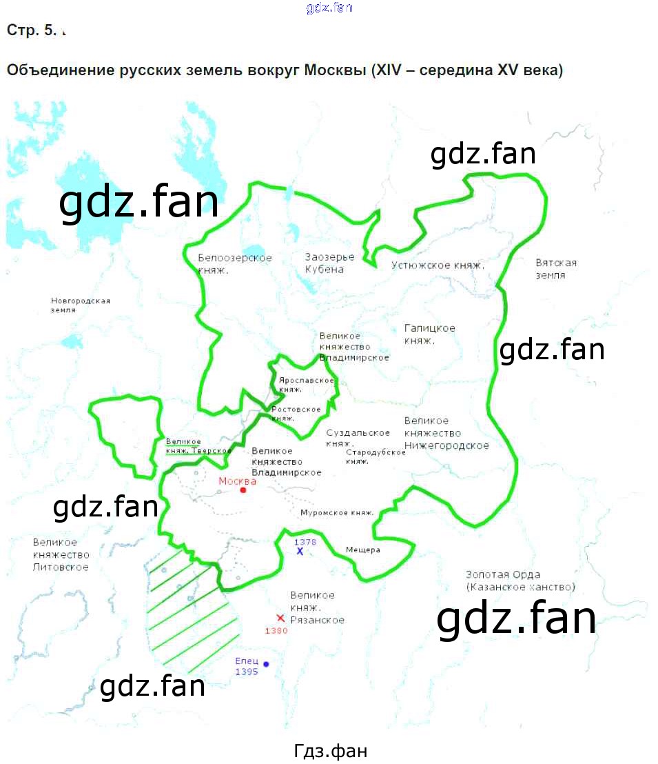 Проверка домашнего задания всегда занимает большое количество времени. На помощь приходит ГДЗ фан по Истории шестого класса. Здесь собраны популярные ответы на 5 (Объединение русских земель вокруг Москвы 14-середина 15 века) История России 6 класс Контурные карты с заданиями Колпаков С.В.