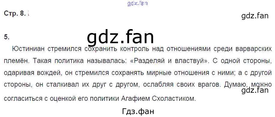 Проверка домашнего задания всегда занимает большое количество времени. На помощь приходит ГДЗ фан по Истории шестого класса. Здесь собраны популярные ответы на 8 (№ 5) История 6 класс рабочая тетрадь Петрова Н.Г. (к уч. Бойцова)