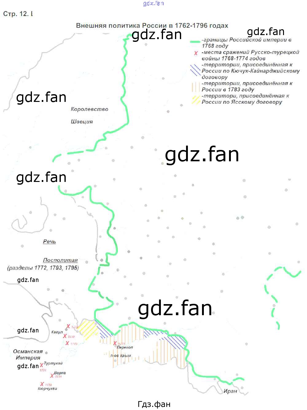 Проверка домашнего задания всегда занимает большое количество времени. На помощь приходит ГДЗ фан по Истории седьмого класса. Здесь собраны популярные ответы на 12 (Внешняя политика в 1762-1796 годах) История 7 класс контурные карты Колпаков С.В.