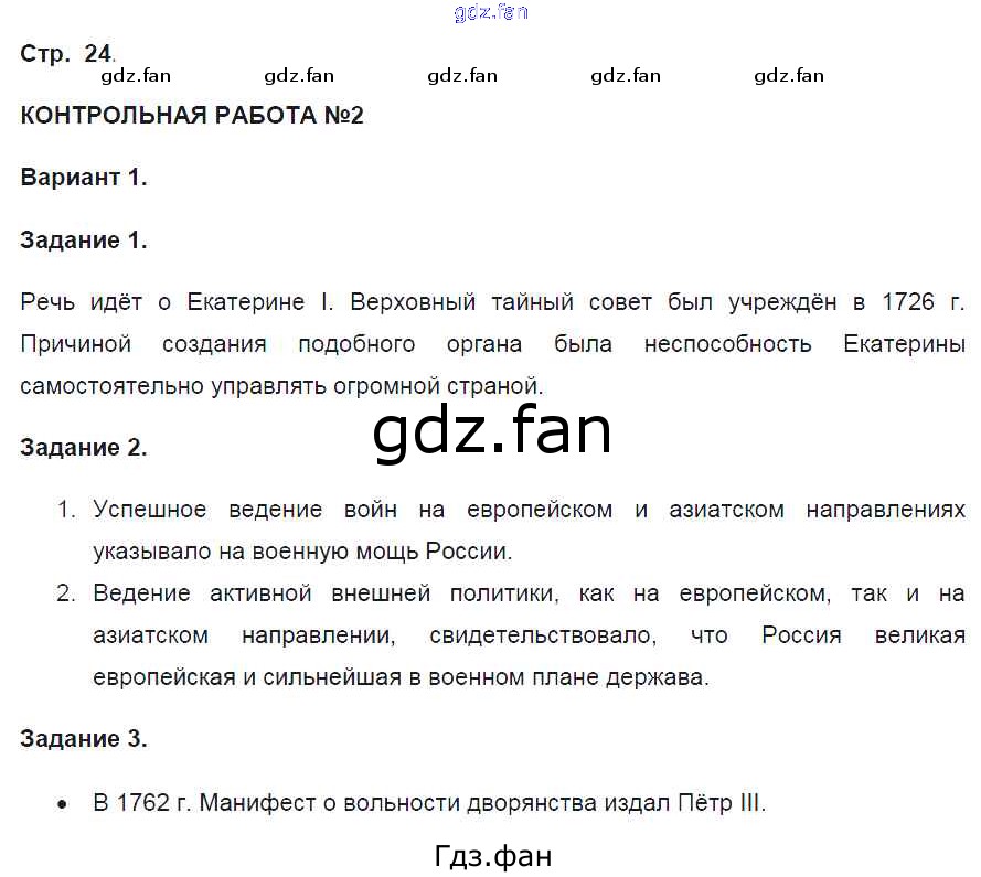 Проверка домашнего задания всегда занимает большое количество времени. На помощь приходит ГДЗ фан по Истории восьмого класса. Здесь собраны популярные ответы на 24 (КР-2. Вариант 1 № 1, 2, 3) История 8 класс контрольные работы Артасов И.А.