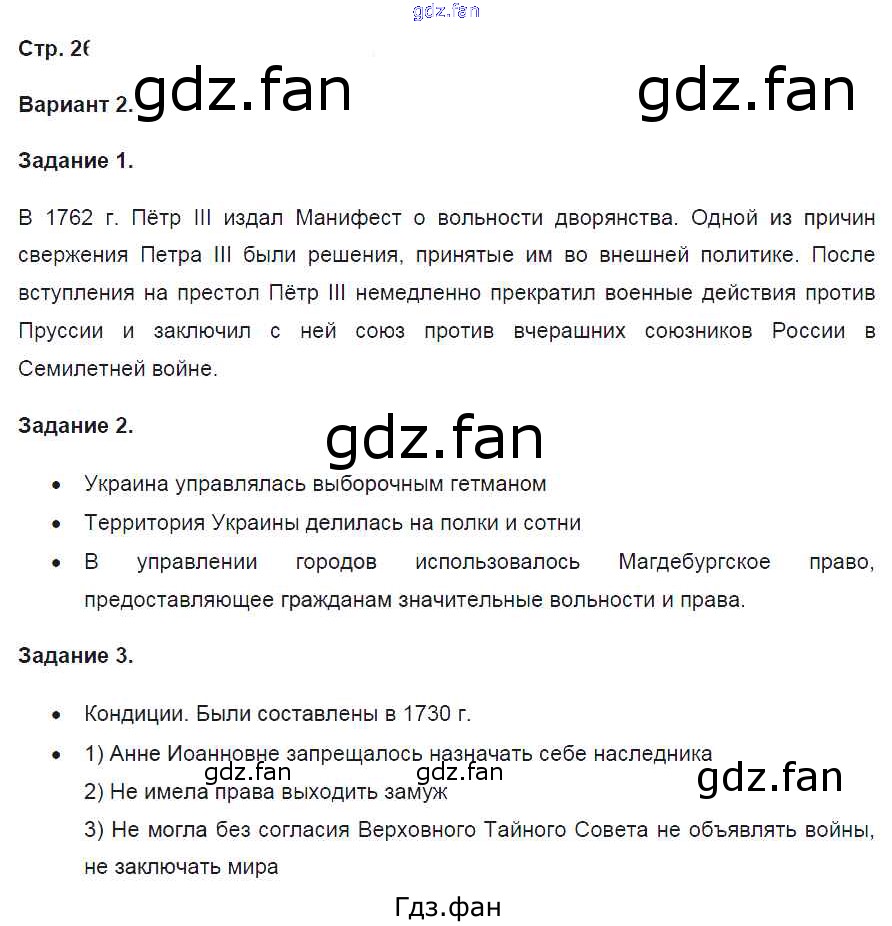 Проверка домашнего задания всегда занимает большое количество времени. На помощь приходит ГДЗ фан по Истории восьмого класса. Здесь собраны популярные ответы на 26 (Вариант 2 № 1, 2, 3) История 8 класс контрольные работы Артасов И.А.