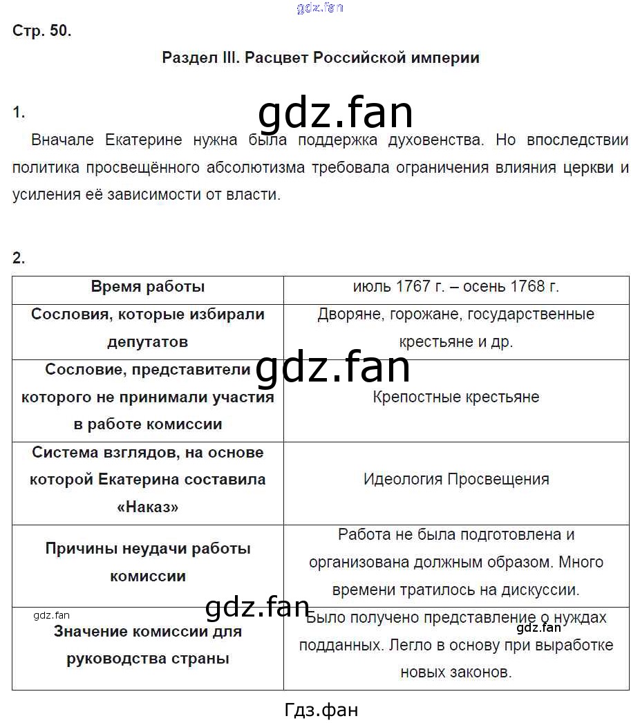 Проверка домашнего задания всегда занимает большое количество времени. На помощь приходит ГДЗ фан по Истории восьмого класса. Здесь собраны популярные ответы на 50 (Раздел 3. Расцвет Российской империи № 1, 2) История России 8 класс рабочая тетрадь Кочегаров К.А.