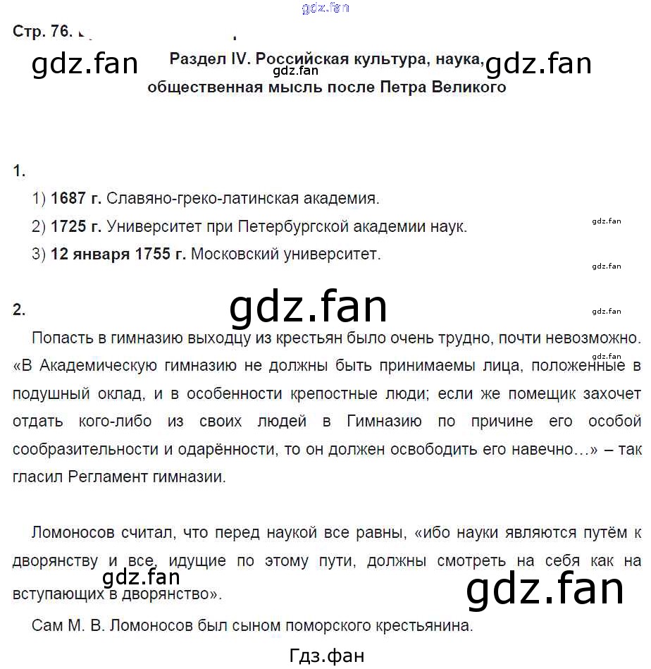 Проверка домашнего задания всегда занимает большое количество времени. На помощь приходит ГДЗ фан по Истории восьмого класса. Здесь собраны популярные ответы на 76 (Раздел 4. Российская культура, наука, общественная мысль после Петра Великого № 1, 2) История России 8 класс рабочая тетрадь Кочегаров К.А.
