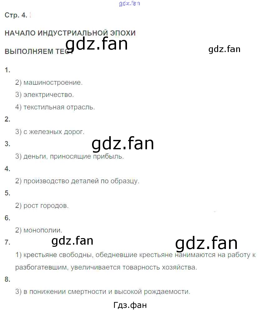 Проверка домашнего задания всегда занимает большое количество времени. На помощь приходит ГДЗ фан по Истории восьмого класса. Здесь собраны популярные ответы на 4 (Начало индустриальной эпохи. Выполняем тест № 1, 2, 3, 4, 5, 6, 7, 8) История 8 класс тетрадь-тренажёр Лазарева А.В.