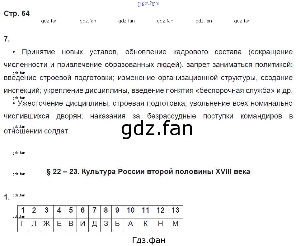 Проверка домашнего задания всегда занимает большое количество времени. На помощь приходит ГДЗ фан по Истории восьмого класса. Здесь собраны популярные ответы на 64 (№ 7, §22-23. Культура России второй половины XVIII века № 1) История России 8 класс рабочая тетрадь Симонова Е.В.