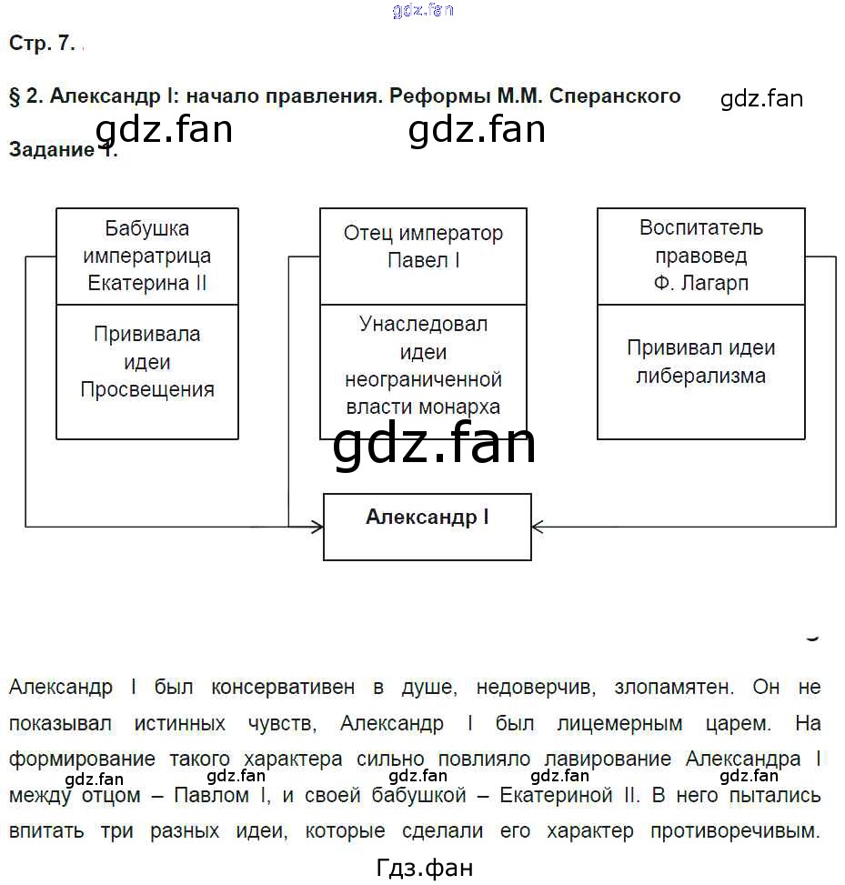 Проверка домашнего задания всегда занимает большое количество времени. На помощь приходит ГДЗ фан по Истории девятого класса. Здесь собраны популярные ответы на 7 (§2. Александр I: начало правления. Реформы М.М. Сперанского № 1) История России 9 класс рабочая тетрадь Чернова М.Н. (к уч. Торкунова А.В.)