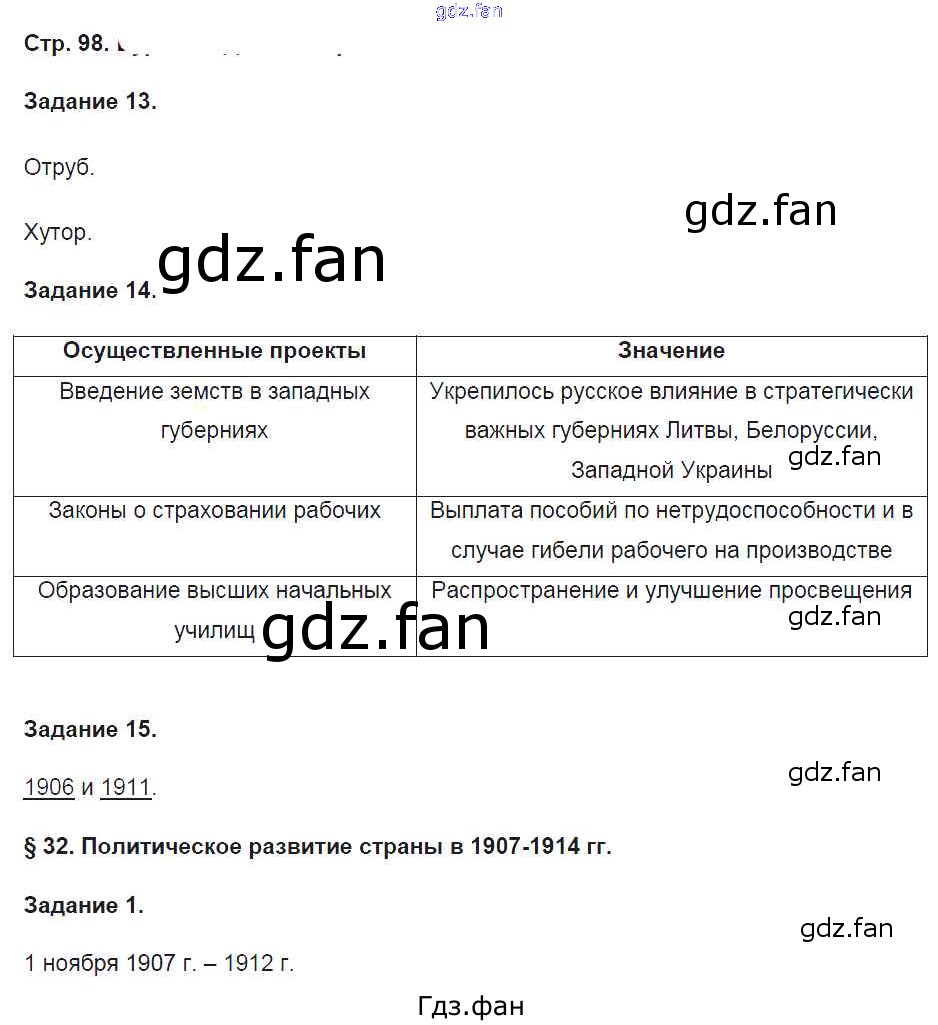 Проверка домашнего задания всегда занимает большое количество времени. На помощь приходит ГДЗ фан по Истории девятого класса. Здесь собраны популярные ответы на 98 (№13, 14, 15. §32. Политическое развитие страны в 1907-1914 гг. № 1) История России 9 класс рабочая тетрадь Чернова М.Н. (к уч. Торкунова А.В.)