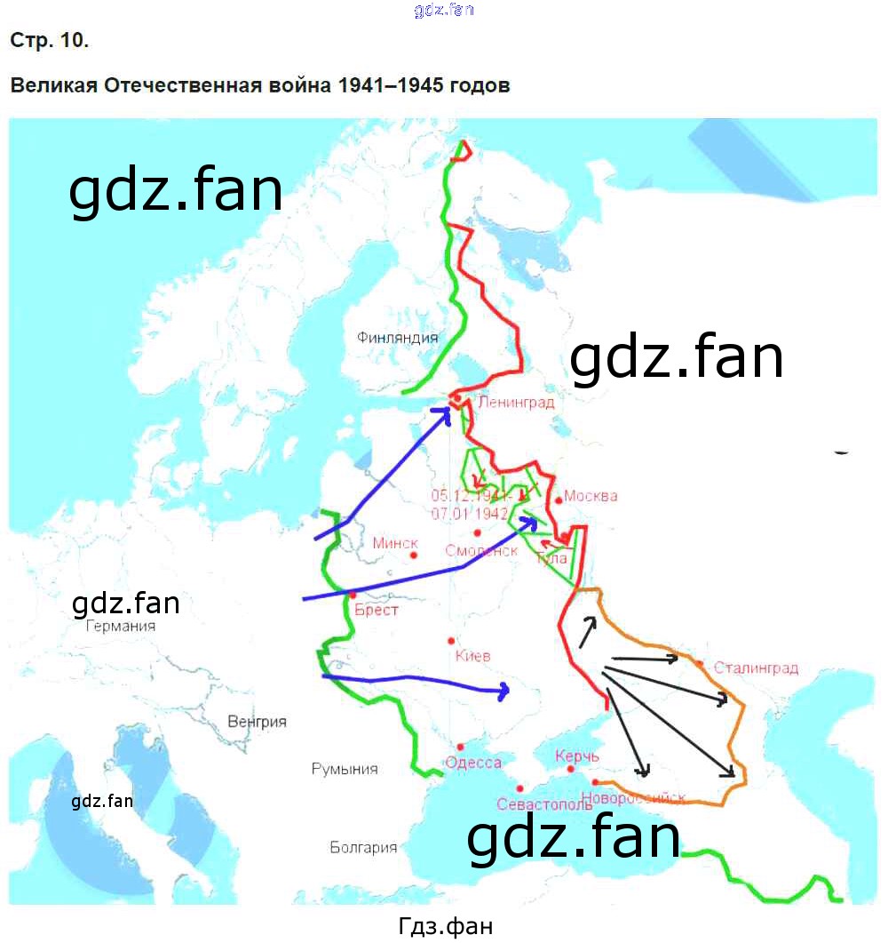 Проверка домашнего задания всегда занимает большое количество времени. На помощь приходит ГДЗ фан по Истории девятого класса. Здесь собраны популярные ответы на 10 (Великая Отечественная война 1941-1945 гг.) История России 9 класс контурные карты с заданиями Колпаков С.В.
