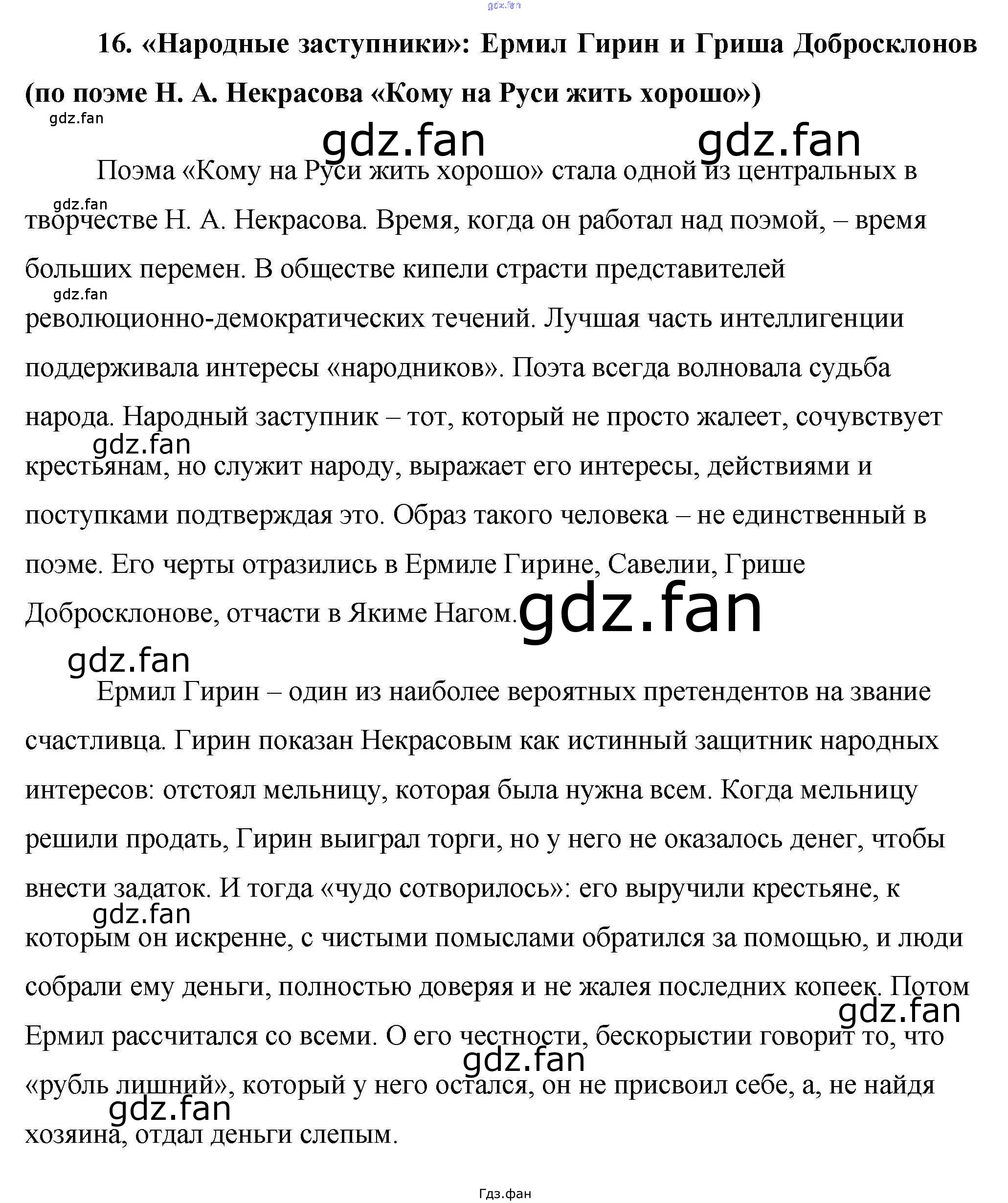 Проверка домашнего задания всегда занимает большое количество времени. На помощь приходит ГДЗ фан по Литературе десятого класса. Здесь собраны популярные ответы на 16. «Народные заступники»: Ермил Гирин и Гриша Добросклонов (по поэме Н. А. Некрасова «Кому на Руси жить хорошо») Готовые сочинения по литературе 10 класс Еременко М. В.