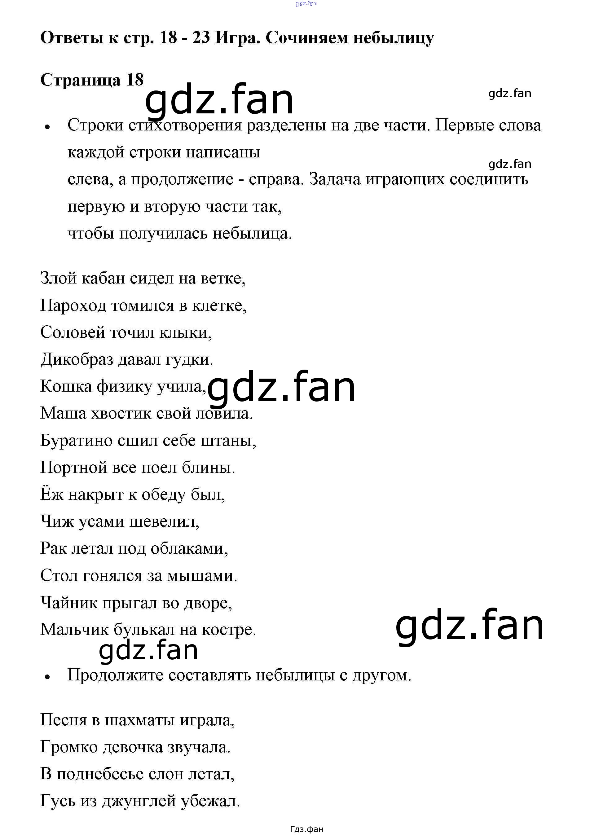 Проверка домашнего задания всегда занимает большое количество времени. На помощь приходит ГДЗ фан по Литературе второго класса. Здесь собраны популярные ответы на Игра. Сочиняем небылицу - 18 Литературное чтение 2 класс рабочая тетрадь Бойкина