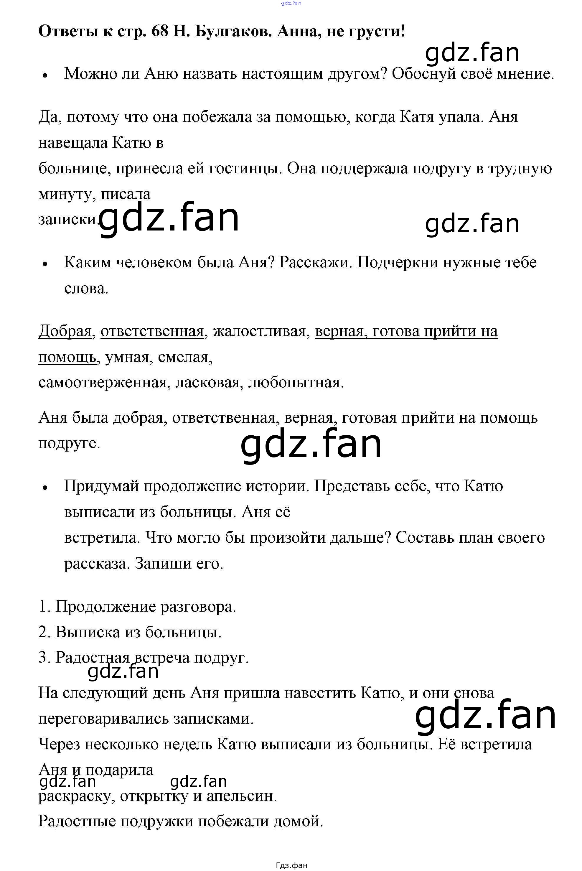 Проверка домашнего задания всегда занимает большое количество времени. На помощь приходит ГДЗ фан по Литературе второго класса. Здесь собраны популярные ответы на Н. Булгаков. Анна, не грусти! - 68 Литературное чтение 2 класс рабочая тетрадь Бойкина