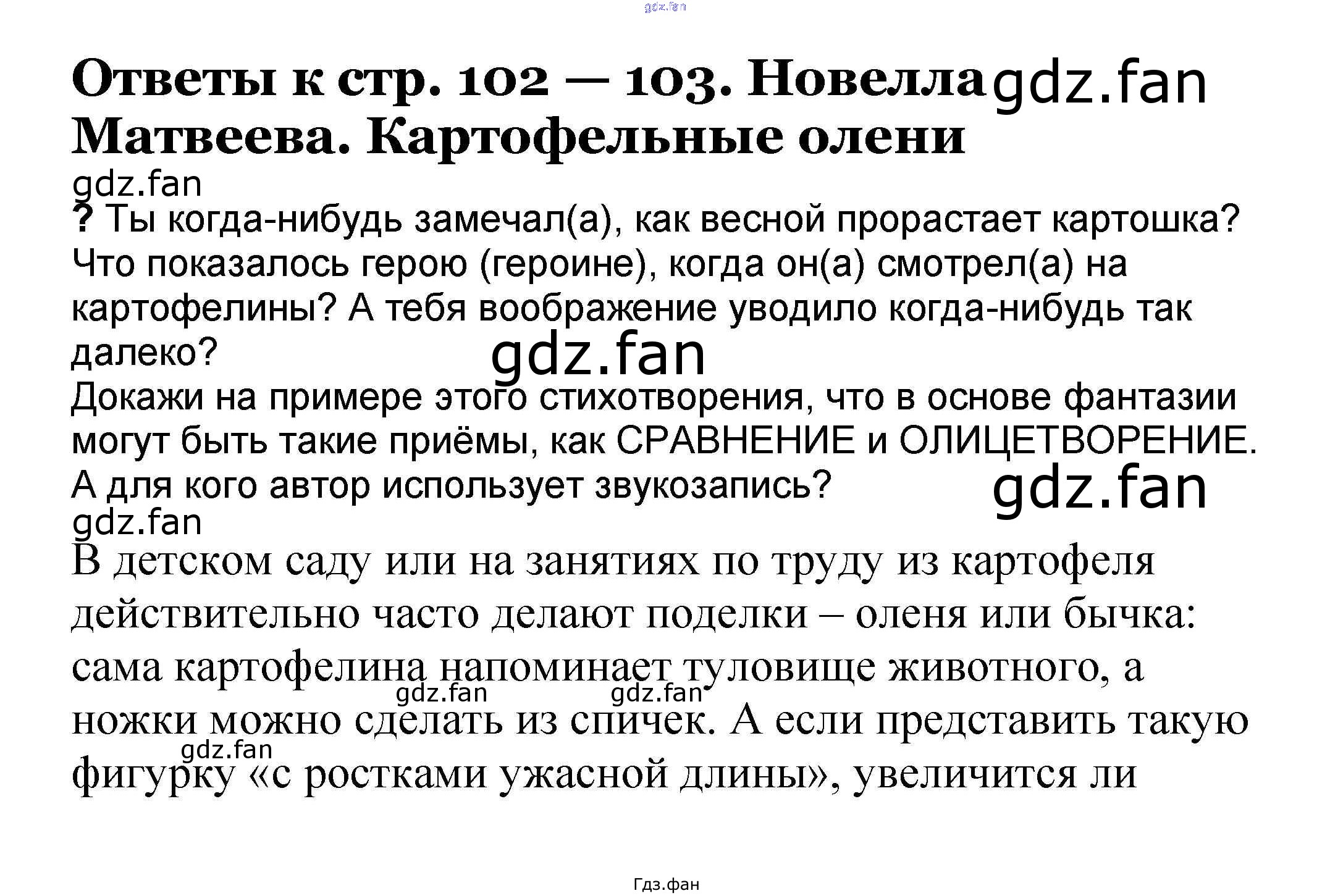 Проверка домашнего задания всегда занимает большое количество времени. На помощь приходит ГДЗ фан по Литературе третьего класса. Здесь собраны популярные ответы на 102-103 (Новелла Матвеева. Картофельные олени) Литературное чтение 3 класс Чуракова Н.А.