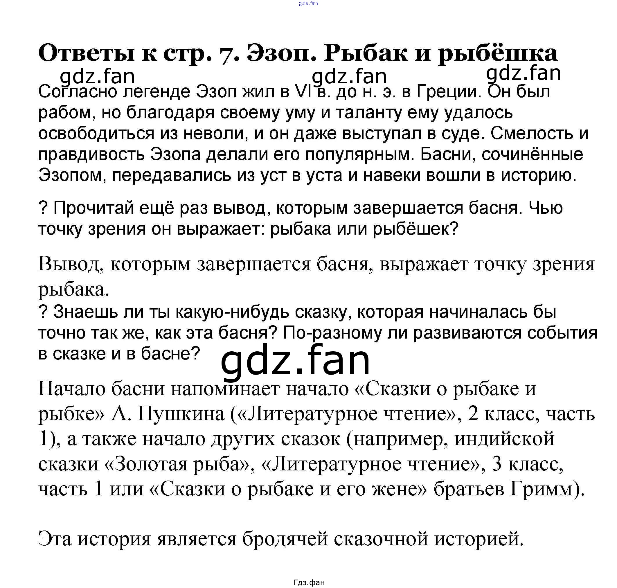 Проверка домашнего задания всегда занимает большое количество времени. На помощь приходит ГДЗ фан по Литературе третьего класса. Здесь собраны популярные ответы на 7 (Эзоп. Рыбак и рыбёшка) Литературное чтение 3 класс Чуракова Н.А.