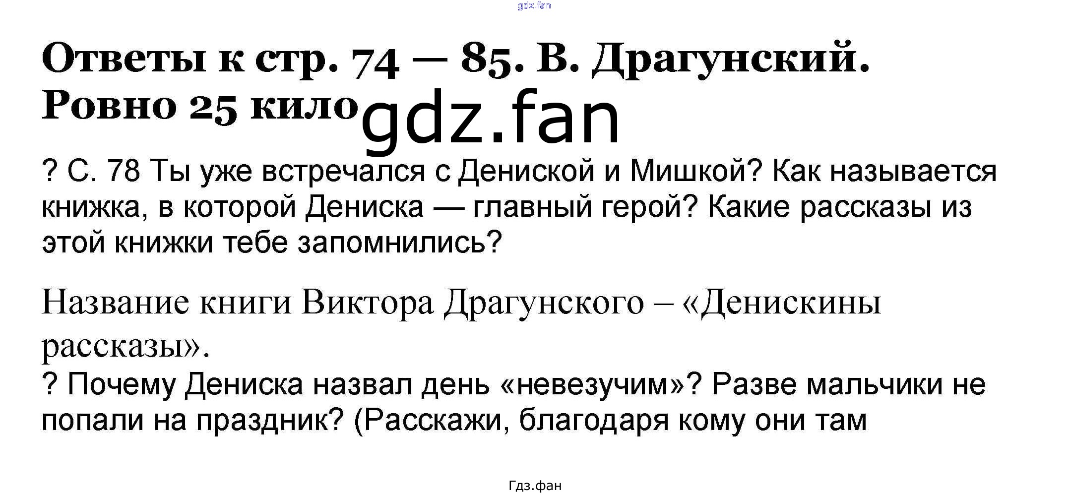Проверка домашнего задания всегда занимает большое количество времени. На помощь приходит ГДЗ фан по Литературе третьего класса. Здесь собраны популярные ответы на 74-85 (В. Драгунский. Ровно 25 кило) Литературное чтение 3 класс Чуракова Н.А.