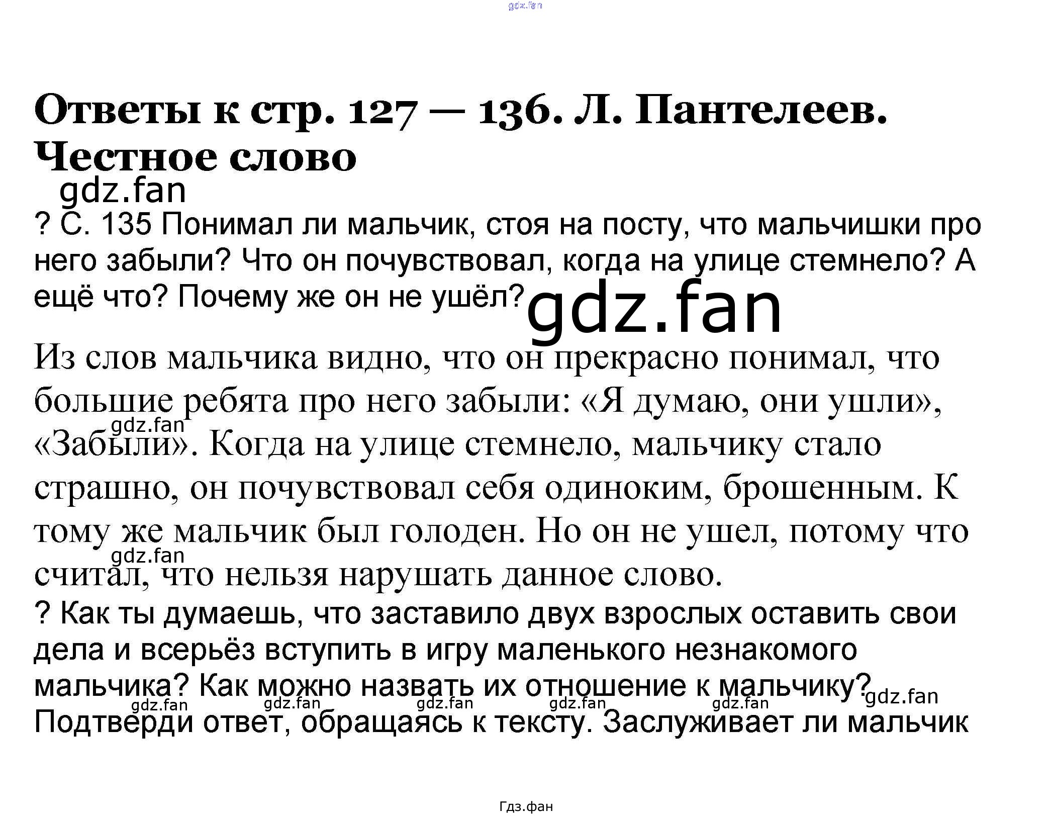 Проверка домашнего задания всегда занимает большое количество времени. На помощь приходит ГДЗ фан по Литературе третьего класса. Здесь собраны популярные ответы на 127-136 (Л. Пантелеев. Честное слово) Литературное чтение 3 класс Чуракова Н.А.