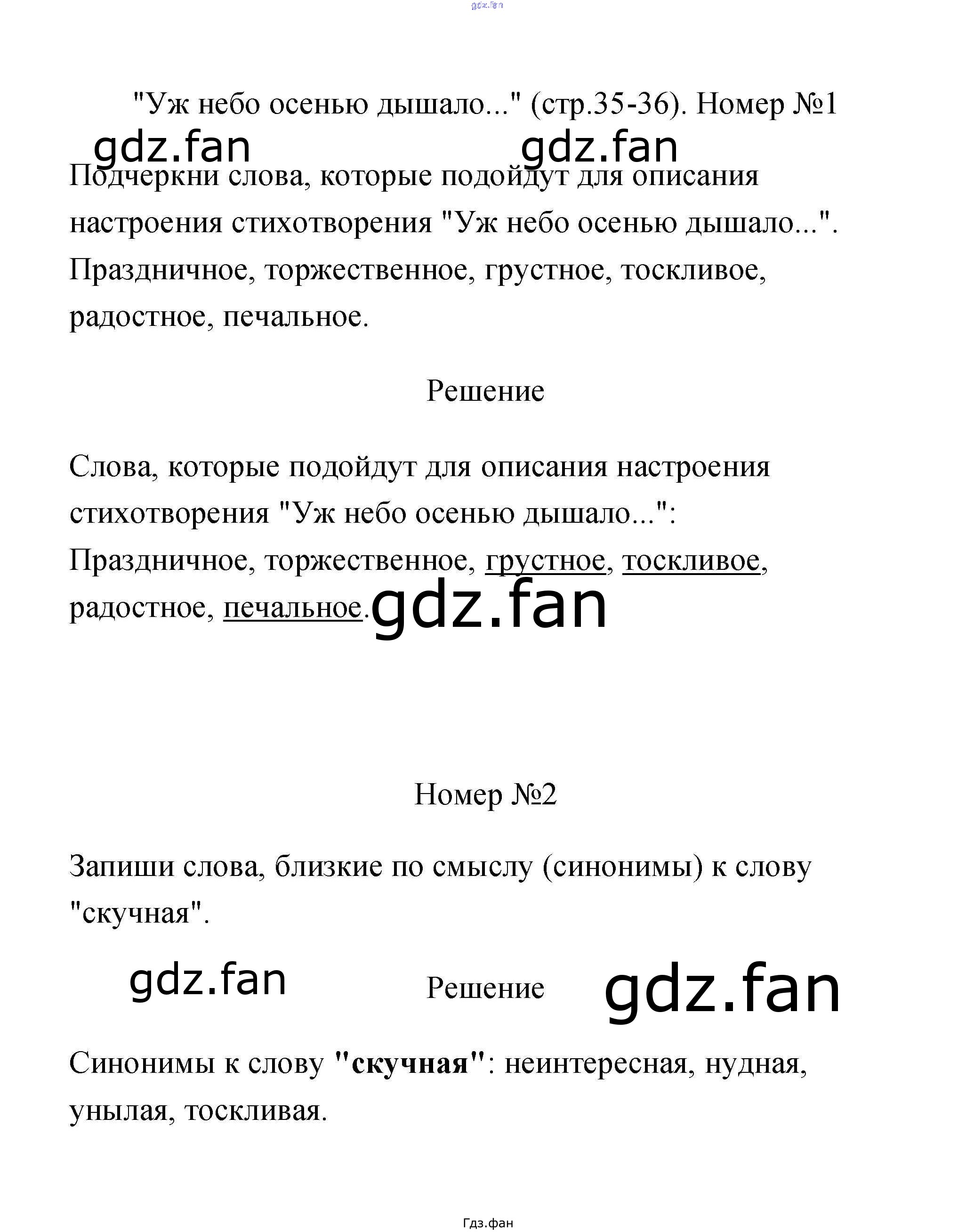 Проверка домашнего задания всегда занимает большое количество времени. На помощь приходит ГДЗ фан по Литературе третьего класса. Здесь собраны популярные ответы на 35 (№ 2. "Уж небо осенью дышало" № 1, 2, 3) Литературное чтение 3 класс рабочая тетрадь Тихомирова