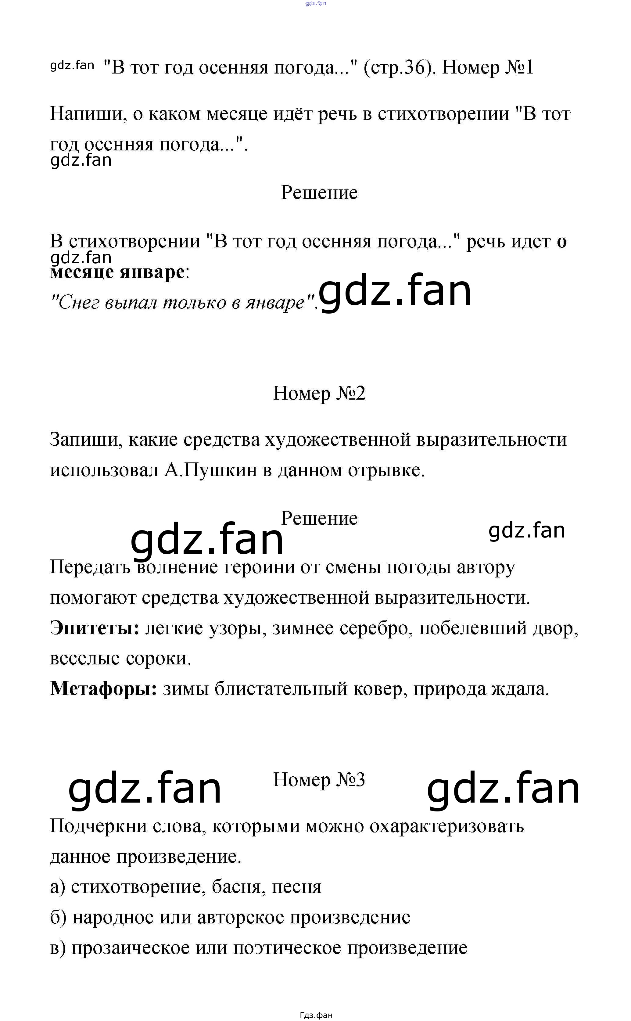 Проверка домашнего задания всегда занимает большое количество времени. На помощь приходит ГДЗ фан по Литературе третьего класса. Здесь собраны популярные ответы на 36 (№ 4. "В тот год осенняя погода" № 1, 2, 3. "Опрятней модного паркета" № 1, 2) Литературное чтение 3 класс рабочая тетрадь Тихомирова