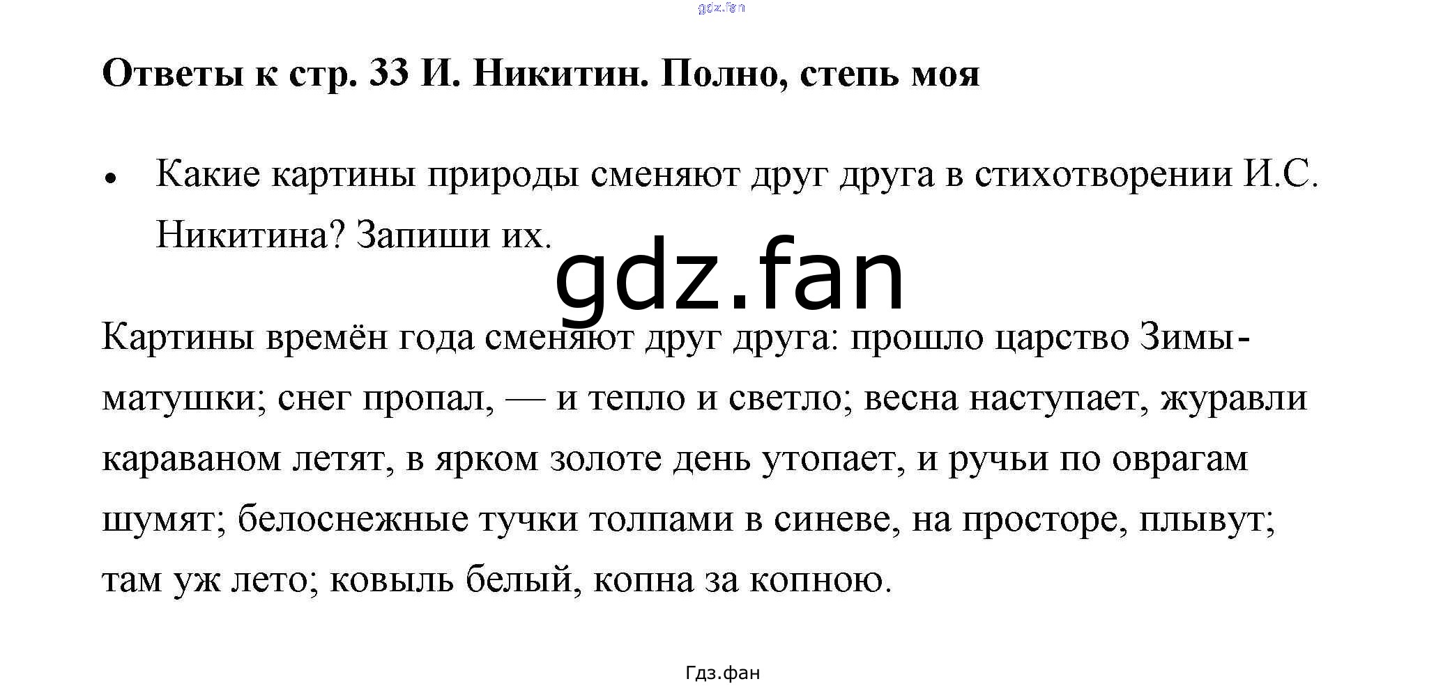 Проверка домашнего задания всегда занимает большое количество времени. На помощь приходит ГДЗ фан по Литературе третьего класса. Здесь собраны популярные ответы на 33 (И. Никитин. Полно, степь моя) Литературное чтение 3 класс рабочая тетрадь Виноградская