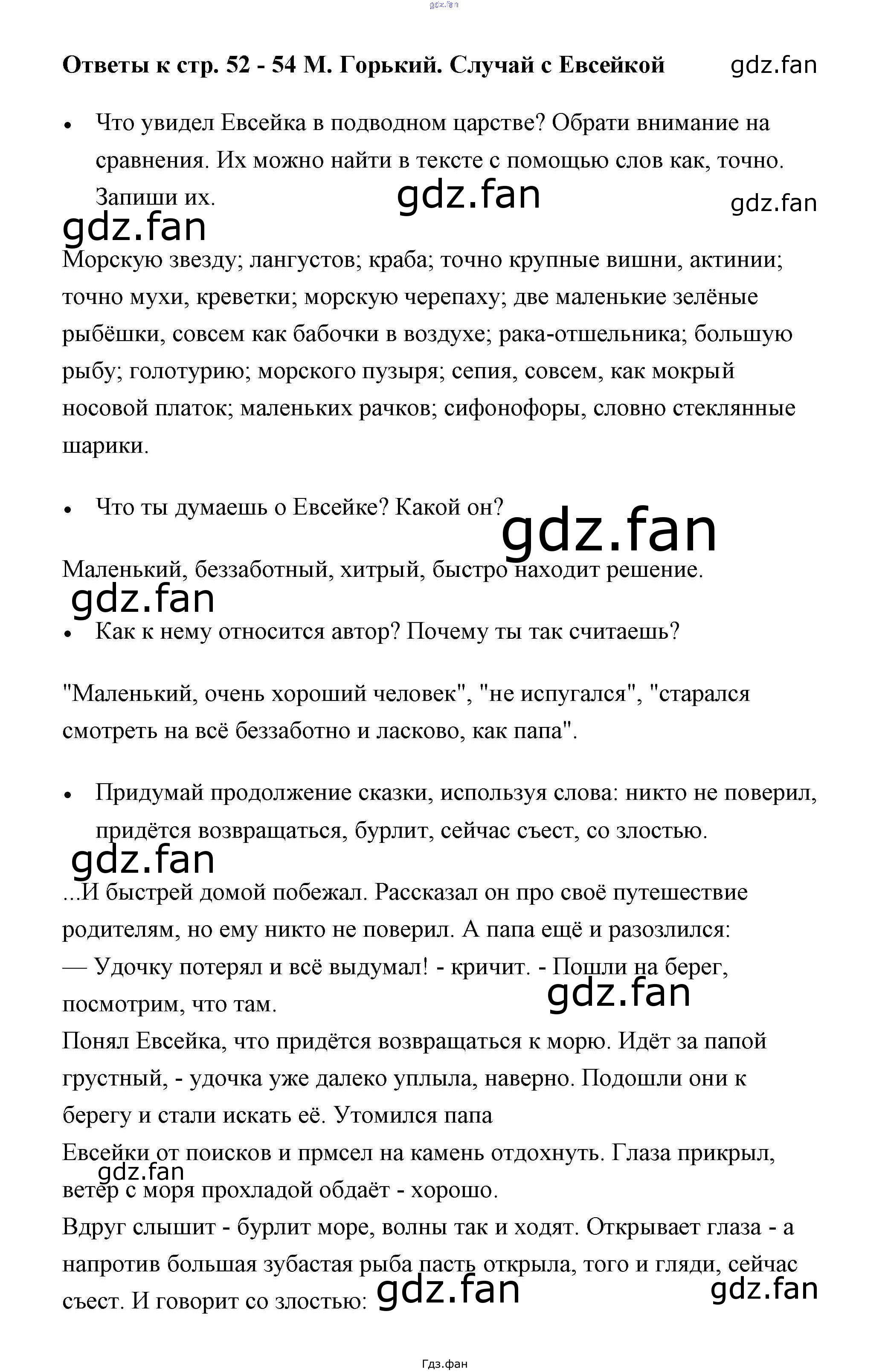 Проверка домашнего задания всегда занимает большое количество времени. На помощь приходит ГДЗ фан по Литературе третьего класса. Здесь собраны популярные ответы на 52-54 (М. Горький. Случай с Евсейкой) Литературное чтение 3 класс рабочая тетрадь Виноградская