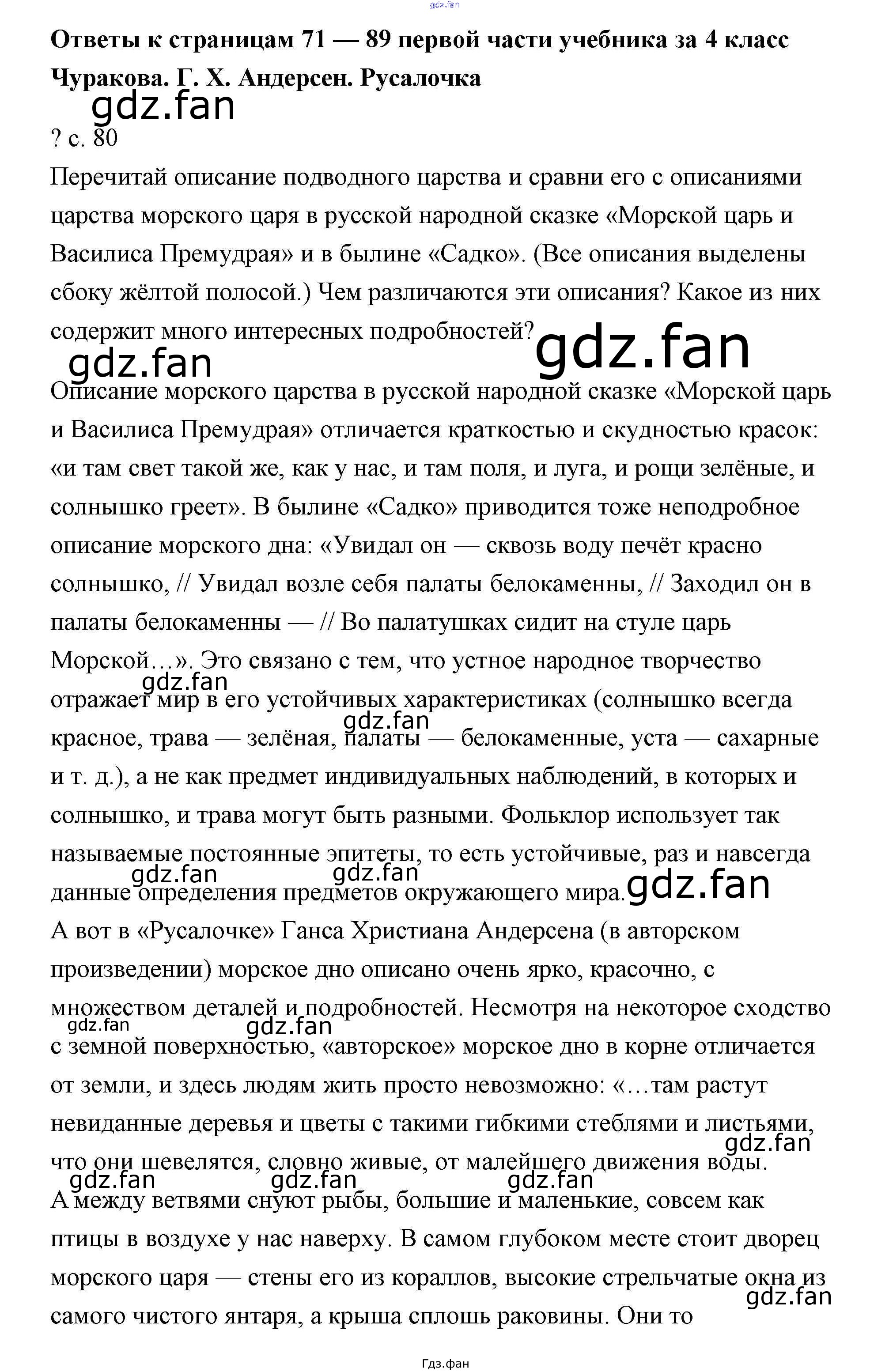 Проверка домашнего задания всегда занимает большое количество времени. На помощь приходит ГДЗ фан по Литературе четвертого класса. Здесь собраны популярные ответы на Г.Х. Андерсен. Русалочка - 80 Литературное чтение 4 класс Чуракова