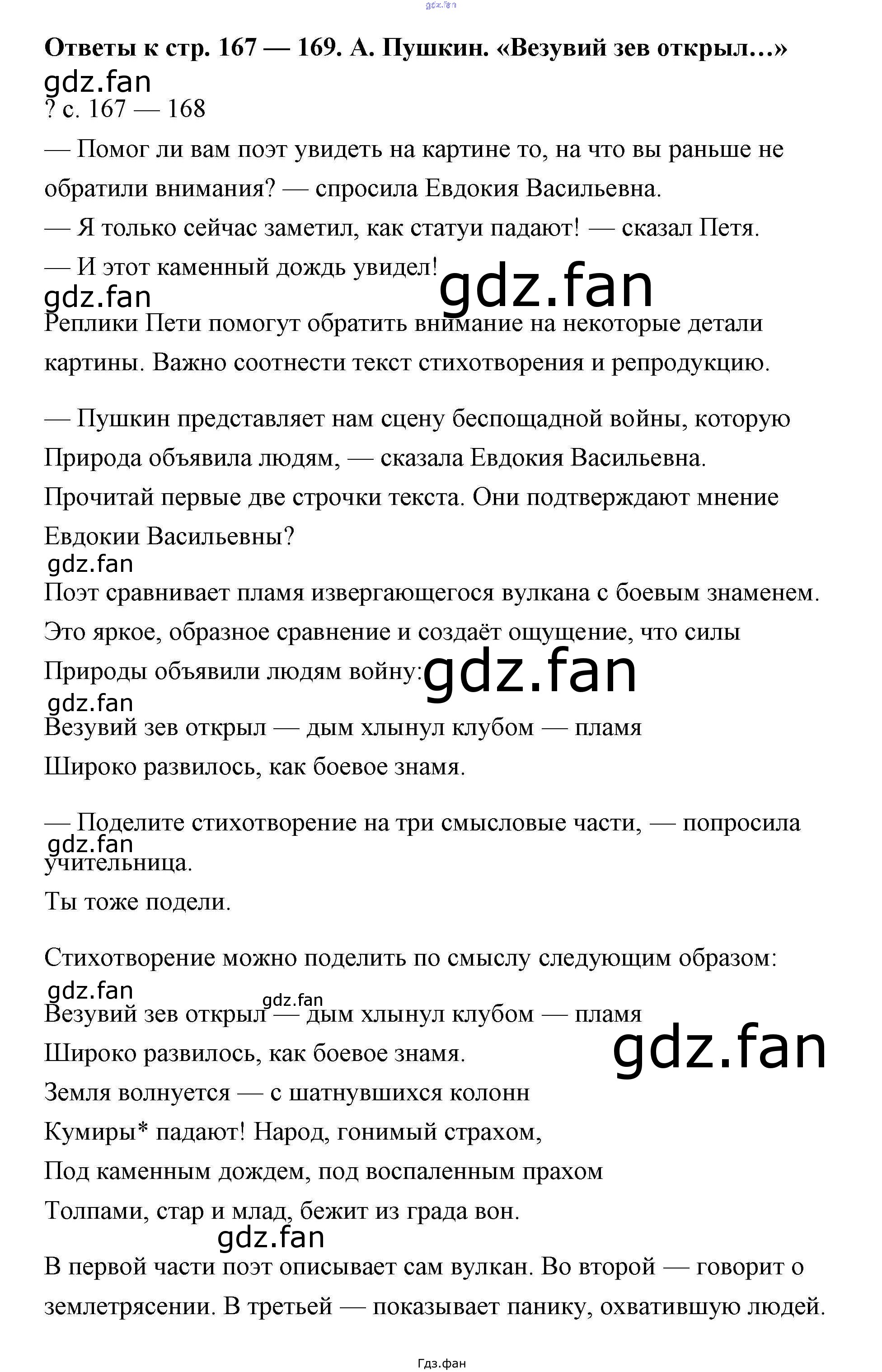Проверка домашнего задания всегда занимает большое количество времени. На помощь приходит ГДЗ фан по Литературе четвертого класса. Здесь собраны популярные ответы на А. Пушкин. »Везувий зев открыл» - 167-168 Литературное чтение 4 класс Чуракова