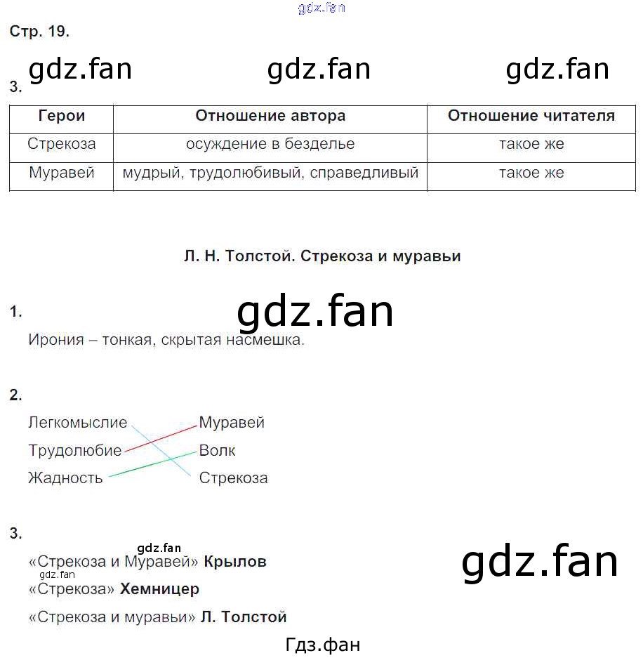 Проверка домашнего задания всегда занимает большое количество времени. На помощь приходит ГДЗ фан по Литературе четвертого класса. Здесь собраны популярные ответы на 19 (№ 3. Л.Н. Толстой. Стрекоза и муравьи № 1, 2, 3) Литературное чтение 4 класс рабочая тетрадь Ефросинина Л.А.