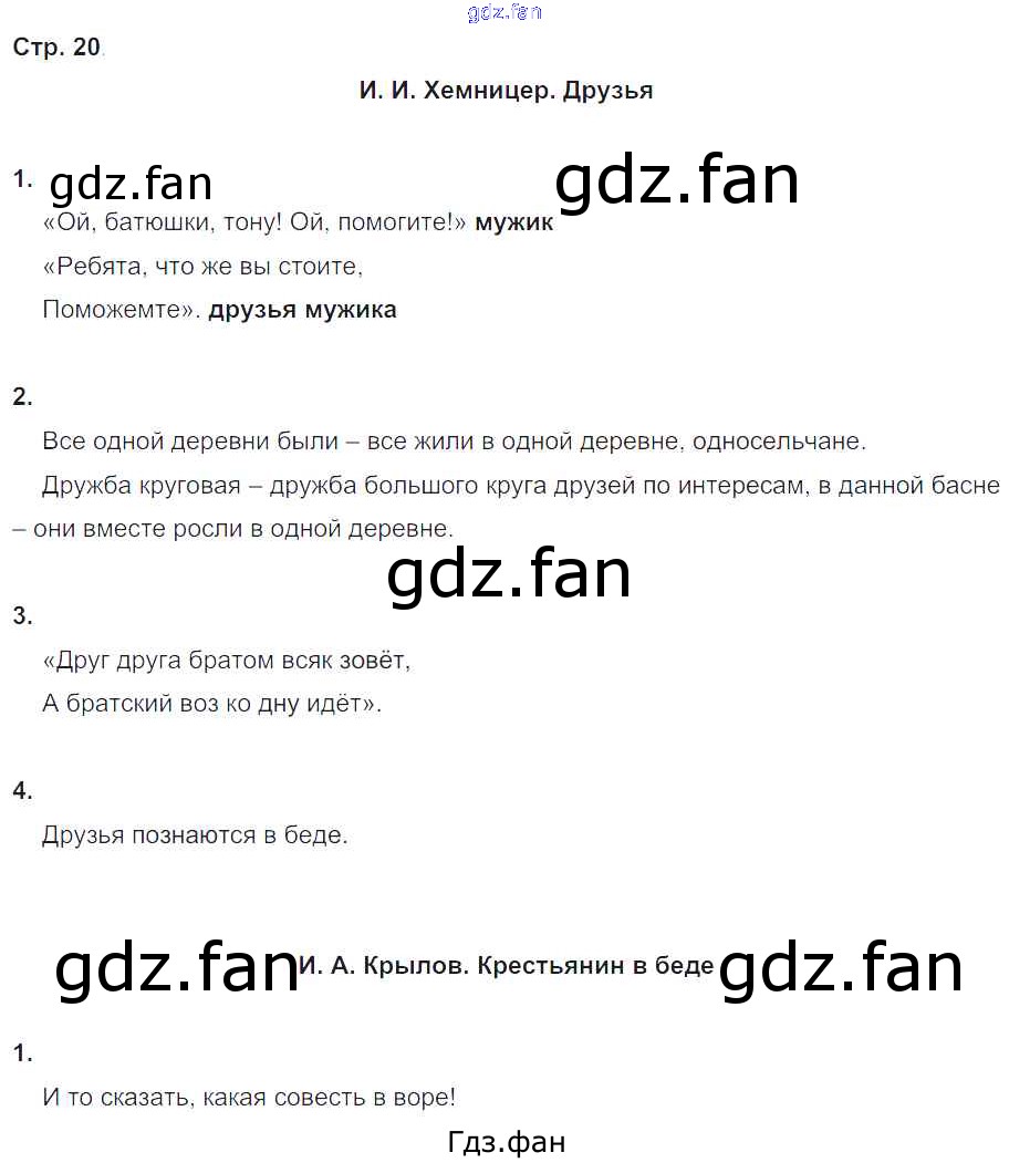 Проверка домашнего задания всегда занимает большое количество времени. На помощь приходит ГДЗ фан по Литературе четвертого класса. Здесь собраны популярные ответы на 20 (И.И. Хемницер. Друзья № 1, 2, 3, 4. И.А. Крылов. Крестьянин в беде № 1) Литературное чтение 4 класс рабочая тетрадь Ефросинина Л.А.