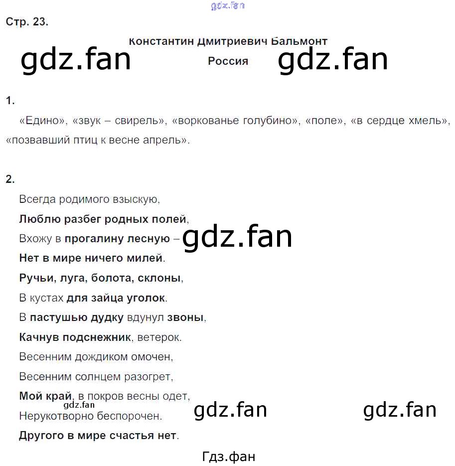 Проверка домашнего задания всегда занимает большое количество времени. На помощь приходит ГДЗ фан по Литературе четвертого класса. Здесь собраны популярные ответы на 23 (К.Д. Бальмонт. Россия № 1, 2) Литературное чтение 4 класс рабочая тетрадь Ефросинина Л.А.