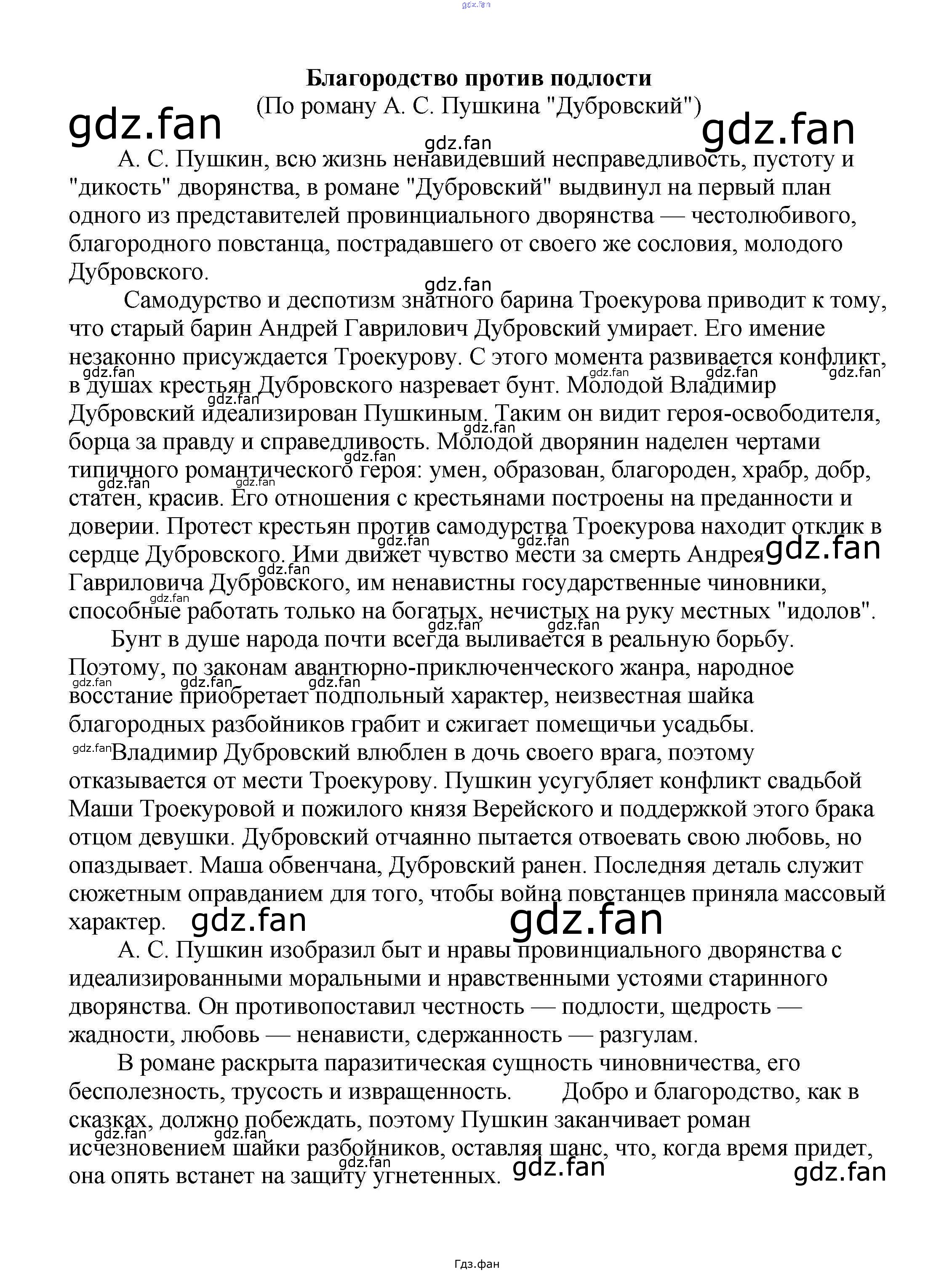 Проверка домашнего задания всегда занимает большое количество времени. На помощь приходит ГДЗ фан по Литературе пятого класса. Здесь собраны популярные ответы на Благородство против подлости (По роману А. С. Пушкина "Дубровский") Сочинения по русской литературе, зарубежной литературе 5-10 классы Белик Э. В.