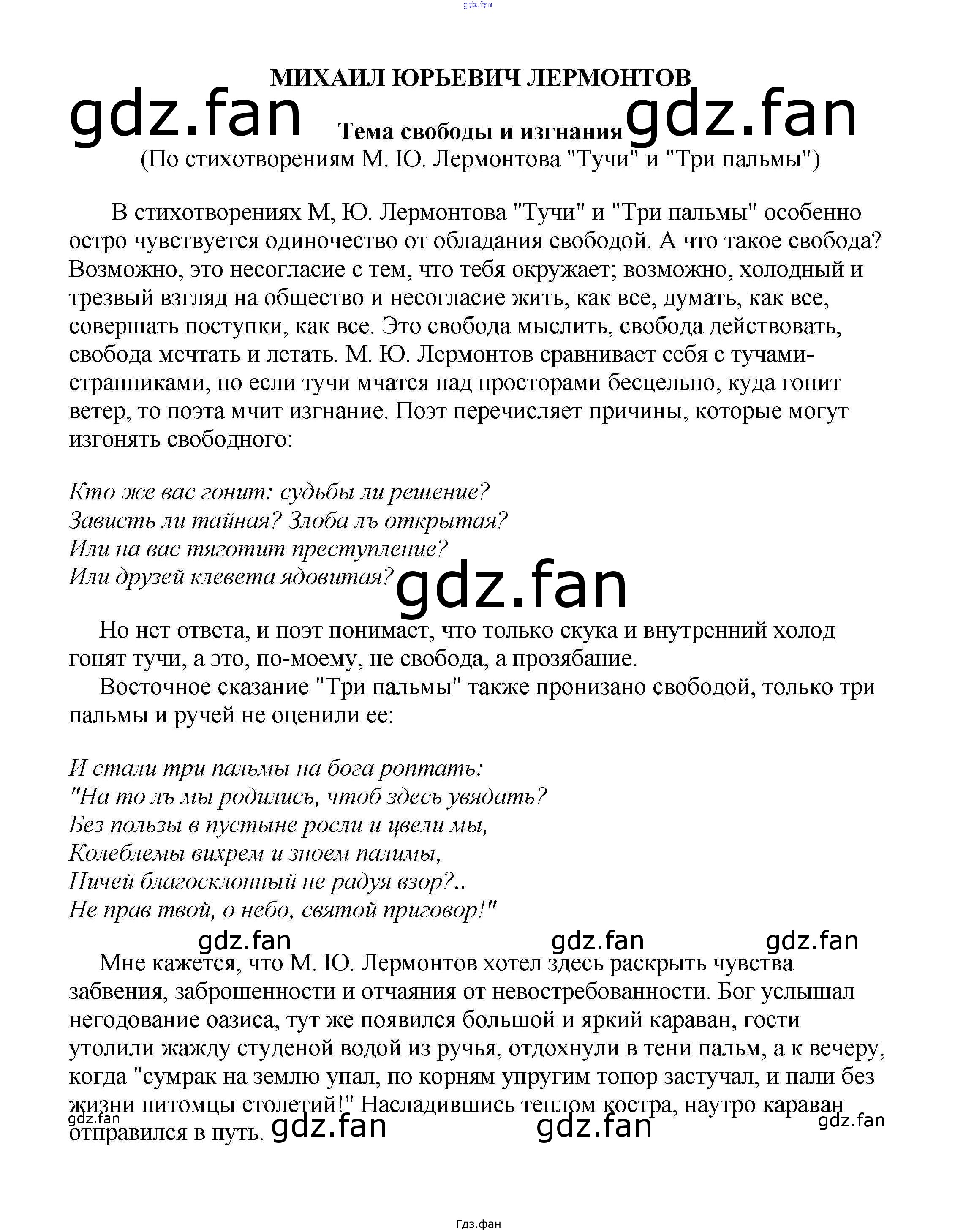 Проверка домашнего задания всегда занимает большое количество времени. На помощь приходит ГДЗ фан по Литературе пятого класса. Здесь собраны популярные ответы на Тема свободы и изгнания (По стихотворениям М. Ю. Лермонтова "Тучи" и "Три пальмы") Сочинения по русской литературе, зарубежной литературе 5-10 классы Белик Э. В.