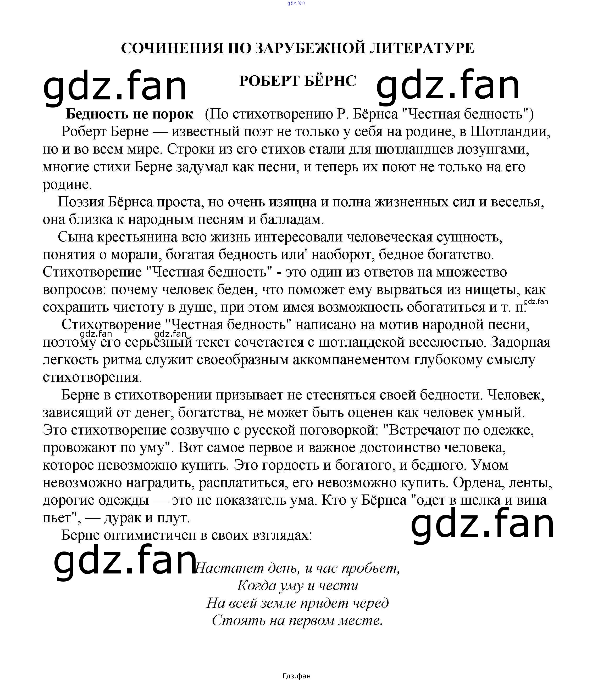 Проверка домашнего задания всегда занимает большое количество времени. На помощь приходит ГДЗ фан по Литературе пятого класса. Здесь собраны популярные ответы на Бедность не порок (По стихотворению Р. Бёрнса "Честная бедность") Сочинения по русской литературе, зарубежной литературе 5-10 классы Белик Э. В.