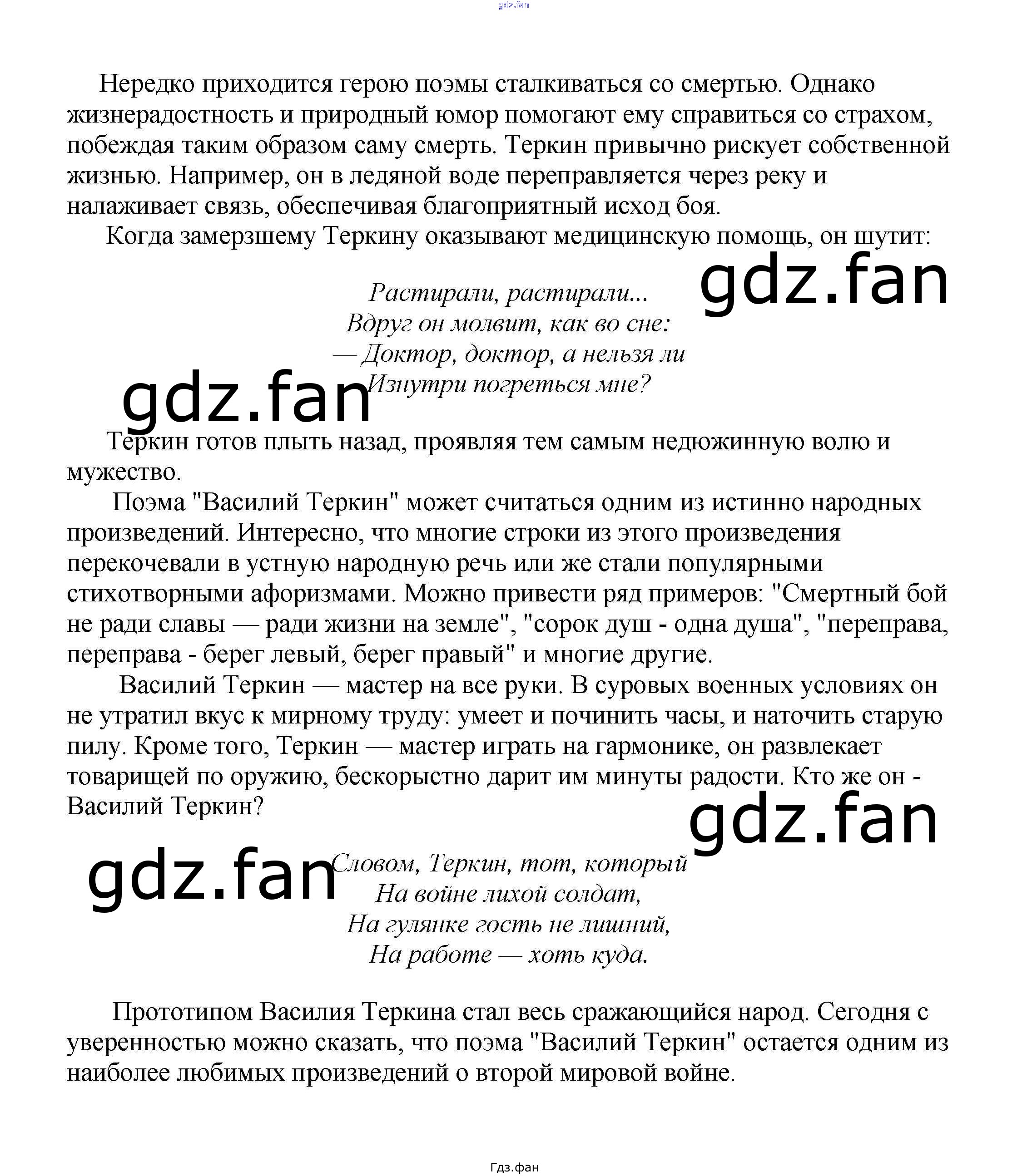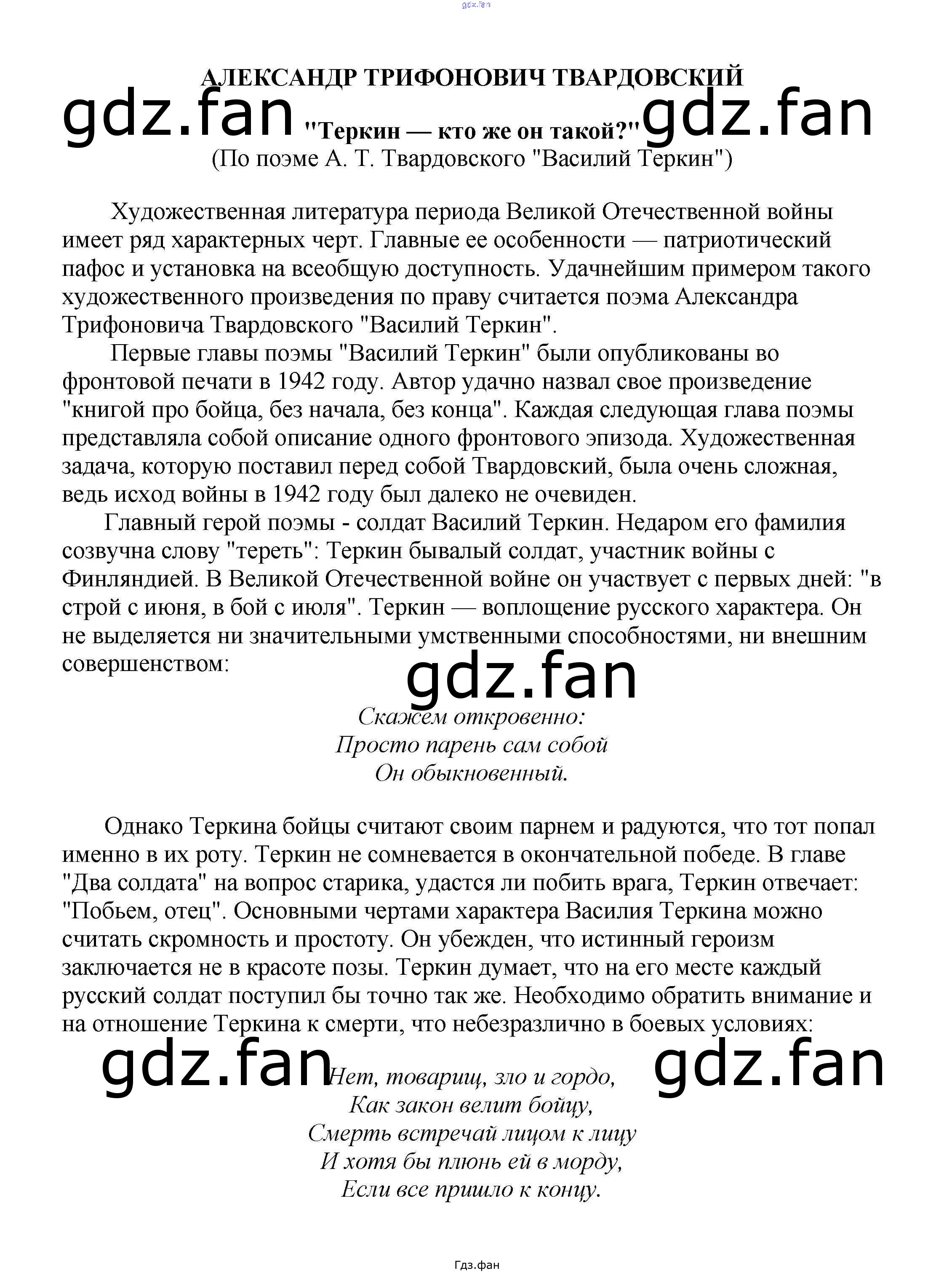 Проверка домашнего задания всегда занимает большое количество времени. На помощь приходит ГДЗ фан по Литературе пятого класса. Здесь собраны популярные ответы на "Теркин — кто же он такой?" (По поэме А. Т. Твардовского "Василий Теркин") Сочинения по русской литературе, зарубежной литературе 5-10 классы Белик Э. В.