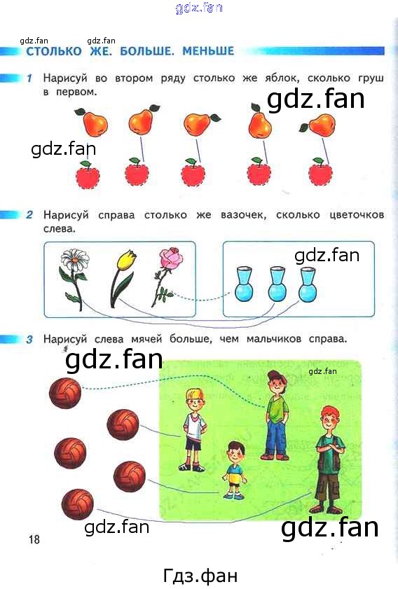 Проверка домашнего задания всегда занимает большое количество времени. На помощь приходит ГДЗ фан по Математике первого класса. Здесь собраны популярные ответы на 18 (Столько же. Больше. Меньше № 1, 2, 3) Математика 1 класс рабочая тетрадь Дорофеев Г.В.