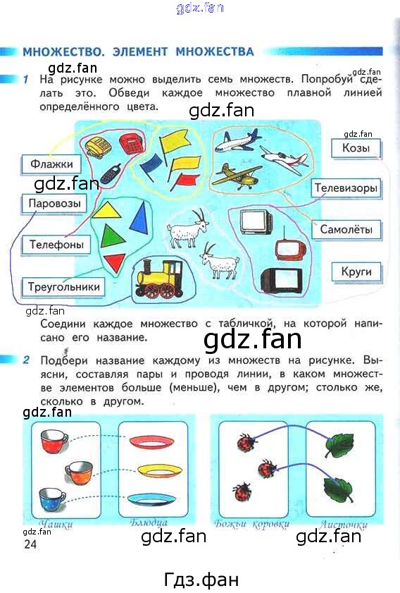 Проверка домашнего задания всегда занимает большое количество времени. На помощь приходит ГДЗ фан по Математике первого класса. Здесь собраны популярные ответы на 24 (Множество. Элемент множества № 1, 2) Математика 1 класс рабочая тетрадь Дорофеев Г.В.