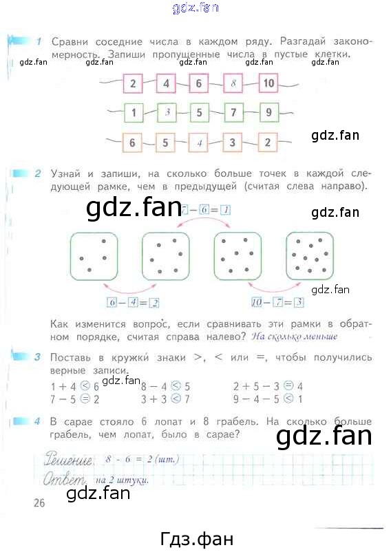 Проверка домашнего задания всегда занимает большое количество времени. На помощь приходит ГДЗ фан по Математике первого класса. Здесь собраны популярные ответы на 26 (№ 1, 2, 3, 4) Математика 1 класс рабочая тетрадь Дорофеев Г.В.