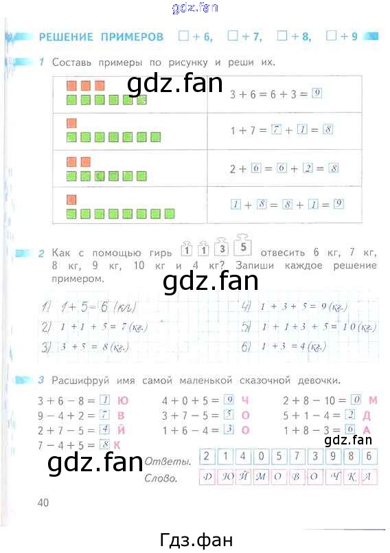 Проверка домашнего задания всегда занимает большое количество времени. На помощь приходит ГДЗ фан по Математике первого класса. Здесь собраны популярные ответы на 40 (Решение примеров □ + 6, □ + 7, □ + 8, □ + 9 № 1, 2, 3) Математика 1 класс рабочая тетрадь Дорофеев Г.В.
