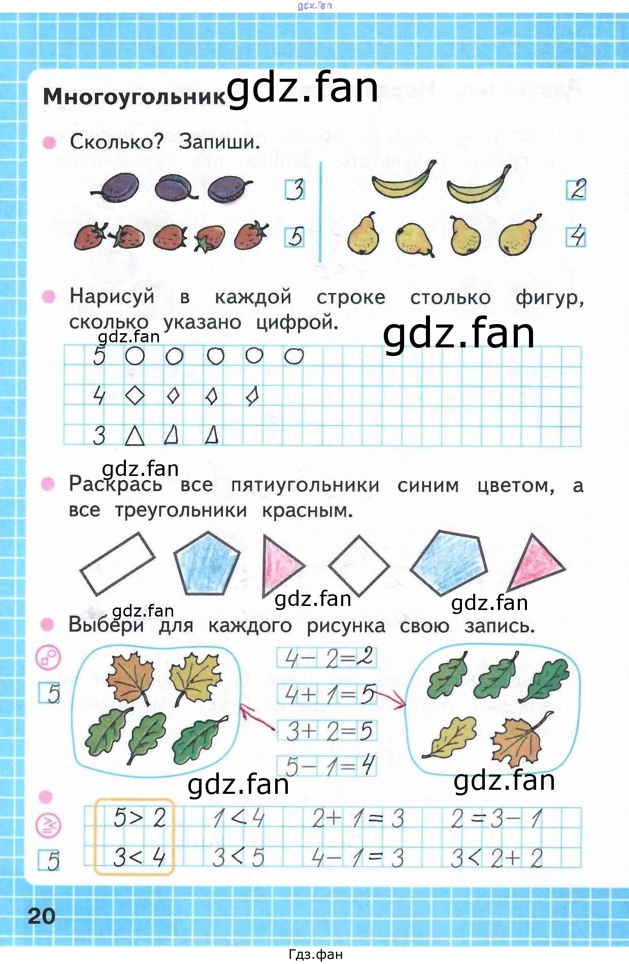 Проверка домашнего задания всегда занимает большое количество времени. На помощь приходит ГДЗ фан по Математике первого класса. Здесь собраны популярные ответы на 20 (многоугольник) Математика 1 класс рабочая тетрадь Моро М.И.
