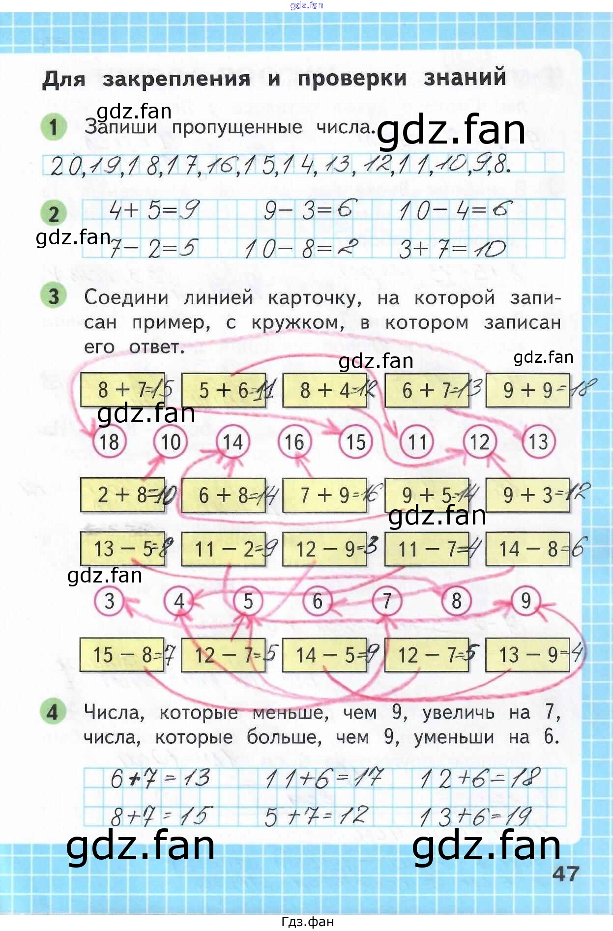 Проверка домашнего задания всегда занимает большое количество времени. На помощь приходит ГДЗ фан по Математике первого класса. Здесь собраны популярные ответы на 47 (для закрепления и проверки знаний. задания 1, 2, 3, 4) Математика 1 класс рабочая тетрадь Моро М.И.