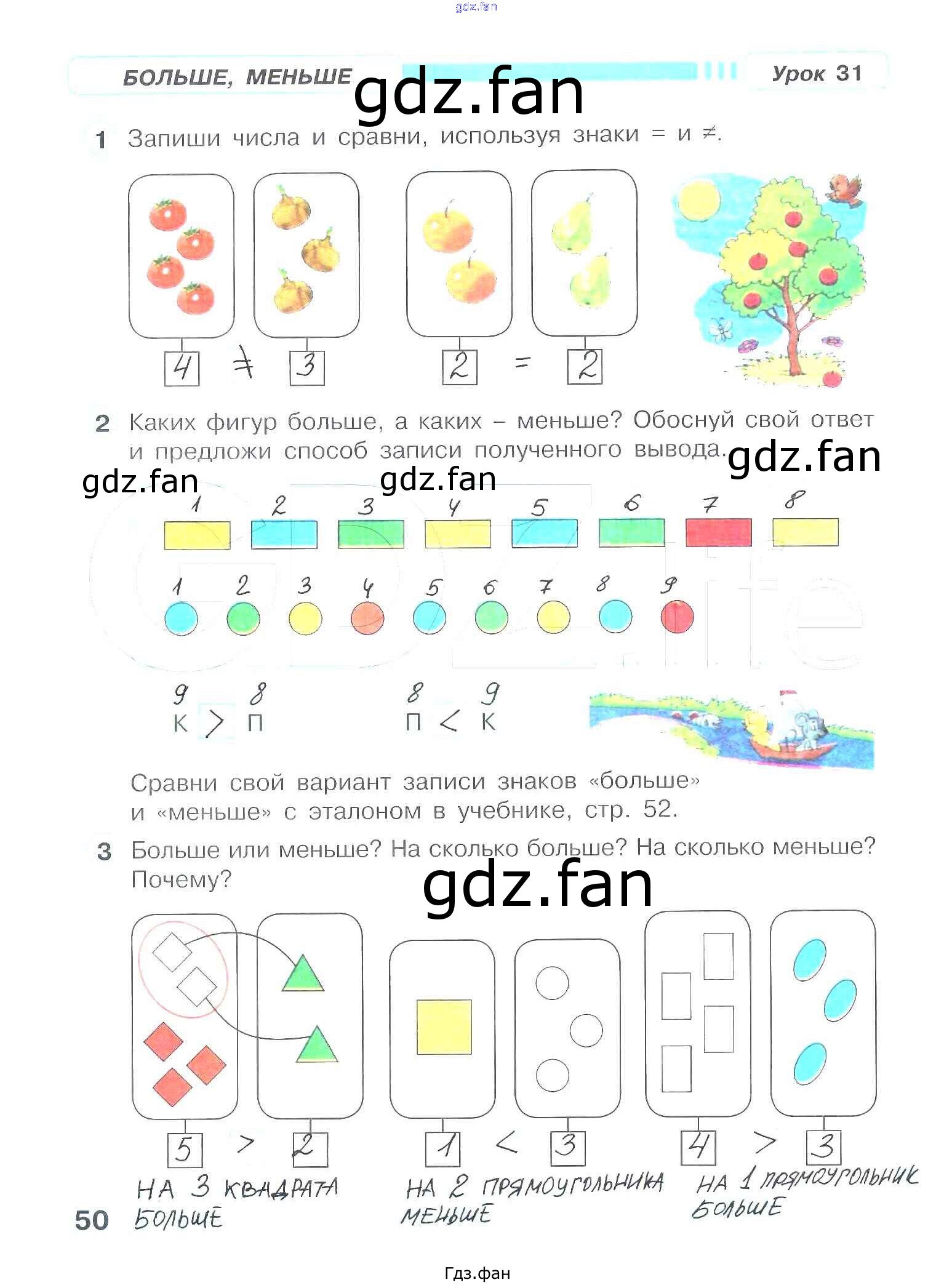Проверка домашнего задания всегда занимает большое количество времени. На помощь приходит ГДЗ фан по Математике первого класса. Здесь собраны популярные ответы на 50 (Больше, меньше. Урок 31 № 1, 2, 3) Математика 1 класс рабочая тетрадь Петерсон Л.Г.