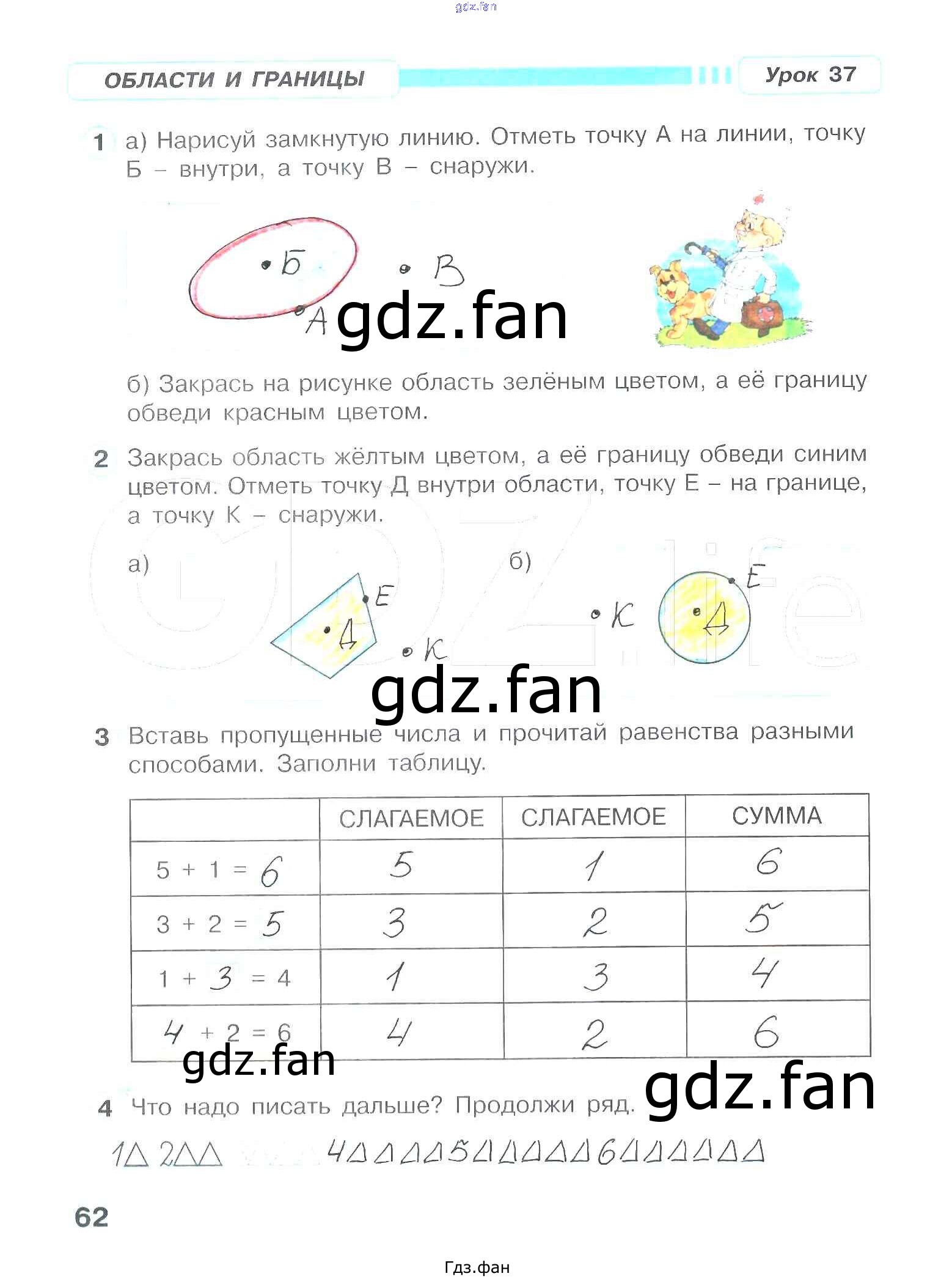 Проверка домашнего задания всегда занимает большое количество времени. На помощь приходит ГДЗ фан по Математике первого класса. Здесь собраны популярные ответы на 62 (Области и границы. Урок 37 № 1, 2, 3, 4) Математика 1 класс рабочая тетрадь Петерсон Л.Г.
