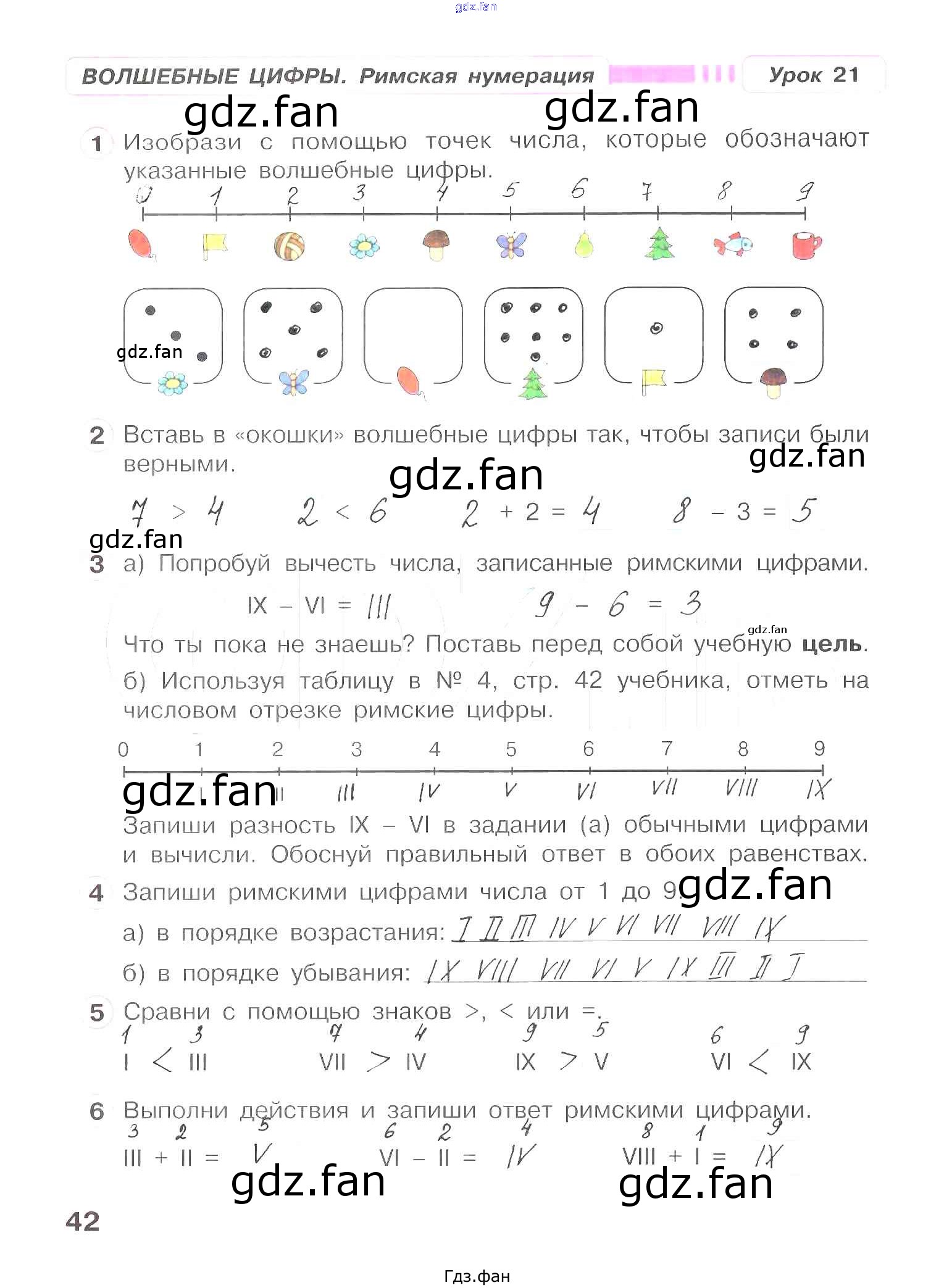 Проверка домашнего задания всегда занимает большое количество времени. На помощь приходит ГДЗ фан по Математике первого класса. Здесь собраны популярные ответы на 42 (Волшебные цифры. Урок 21 № 1, 2, 3, 4, 5, 6) Математика 1 класс рабочая тетрадь Петерсон Л.Г.